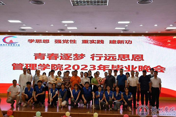 6月18日晚,管理学院在明理楼一楼学术报告厅举行“ ‘学思想 强党性 重实践 建新功’——青春逐梦、行远思恩” 2023届毕业生晚会。学生工作部(处)部(处)长李德华、广西梧州义信建筑工程有限公司、梧州顺鑫网络科技有限公司董事长袁鹏、学生工作部(处)部副(处)长黄立勇、学院党委书记冀宁、院长张堂云、党委副书记陈兴、学院教师代表、全体辅导员和2023届毕业生参加晚会。