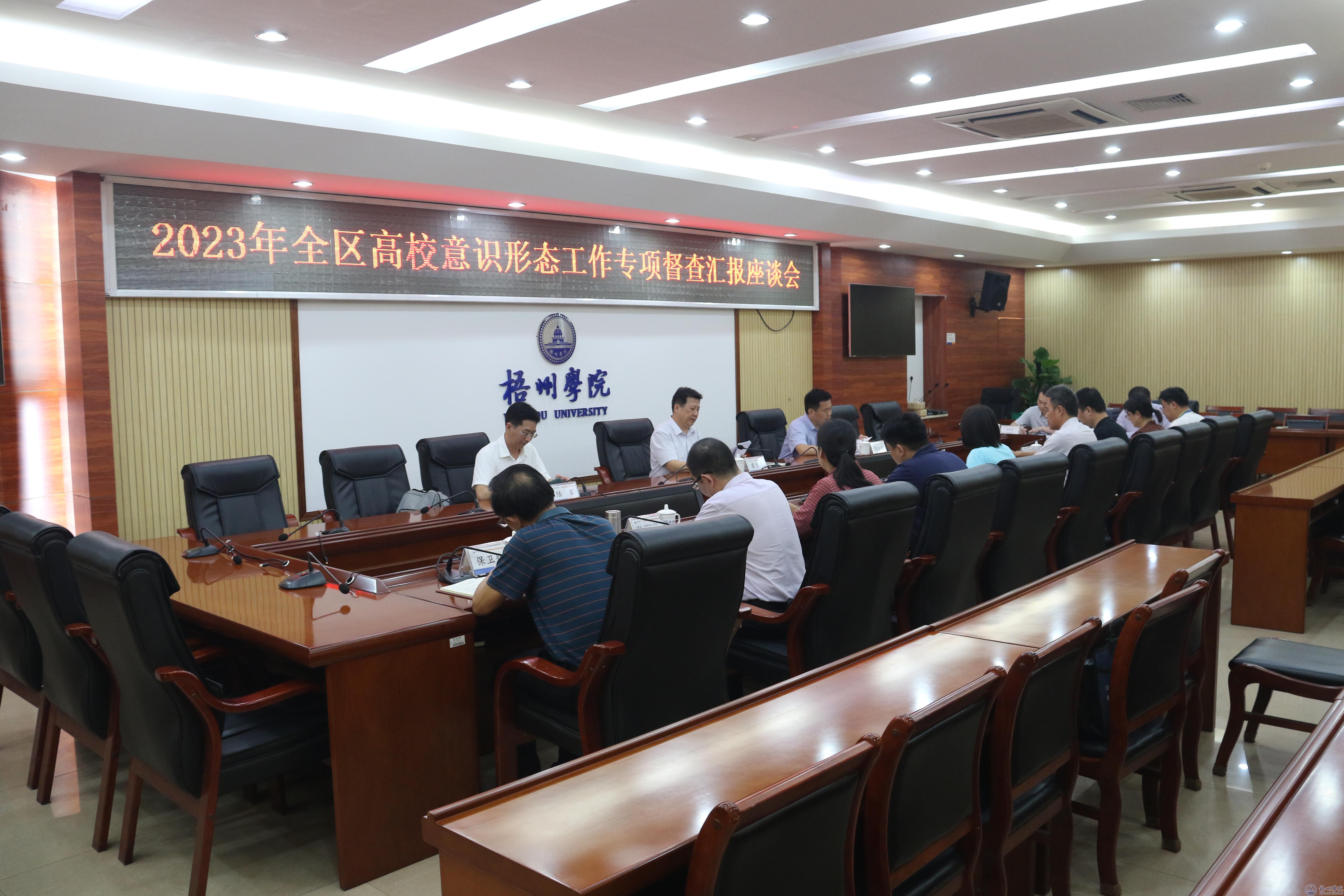 7月6日下午,以广西财经学院党委常委、宣传部部长梁方正为组长,广西财经学院团委书记芮红磊、南宁职业技术学院党委宣传部副部长陆军为督查组成员的2023年全区高校意识形态工作督查组一行到我校督查意识形态工作。学校在明理楼八楼第一会议室召开工作汇报座谈会,学校党委常委莫晨宇主持会议,办公室、组织部(统战部)、宣传部、学生工作部(处)、人事处、教务处、科研处、国际交流处、保卫处、校团委分管意识形态工作领导参加会议。