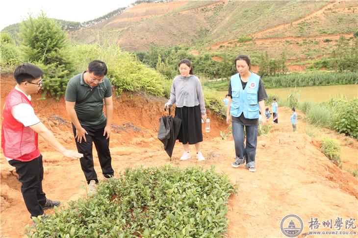 在万秀区夏郢镇凤凰村,秦伟和外国语学院实践团师生到该村六堡茶种植基地调