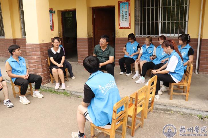 走访过程中,各实践团汇报了几天以来的实践收获和调研情况:在万秀区夏郢镇思委村,管理学院实践团成员介绍了思委村的村情民情以及思委农家米的种植与产销情况;在万秀区夏郢镇凤凰村,外国语学院实践团成员介绍了党史学习和探寻红色资源情况;在苍梧县旺甫中心小学,宝石与艺术设计学院实践团成员介绍了“阳光书画屋”的建设情况;在苍梧县木双镇西中村,电子与信息工程学院实践团介绍了对该村乡村振兴调研工作和理论宣讲情况;在万秀区城东镇河口村,教师教育学院实践团介绍了手工、书法、音乐、舞蹈、课业辅导、英语等兴趣培训班开展情况和成果展示文艺晚会筹备情况。秦伟分别对各实践团提出指导意见和建议,他要求各实践团要充分发挥专业优势、打造品牌,鼓励同学们将所学知识运用到实践中,发挥青春智慧和力量积极助力乡村建设。