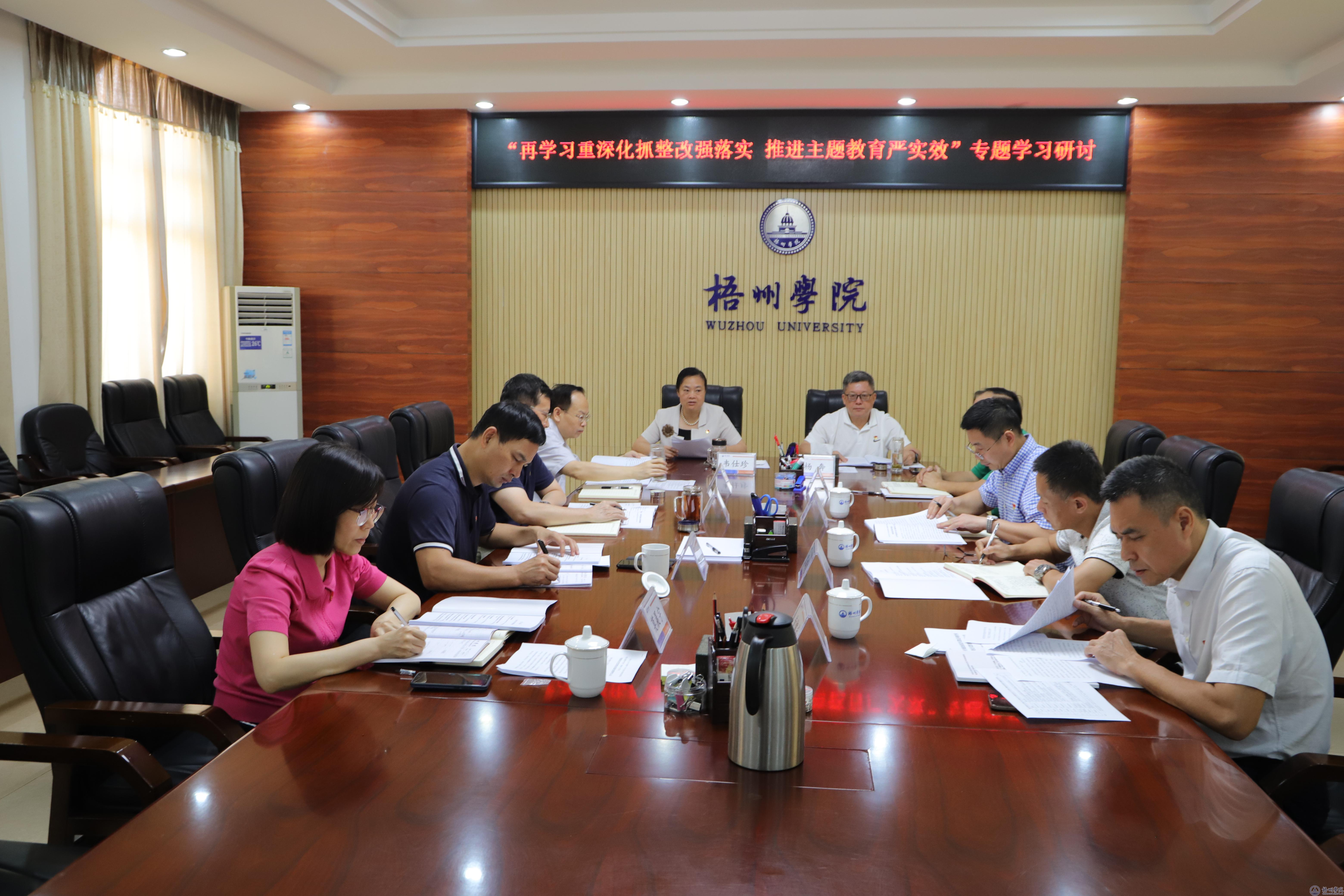 按照自治区党委主题教育工作安排和自治区第十二巡回指导组指导意见,7月19-20日,学校领导在明理楼八楼第二会议室开展深入学习贯彻习近平新时代中国特色社会主义思想“再学习重深化抓整改强落实,推进主题教育严实效”专题学习集中研讨。研讨会由校党委书记韦仕珍主持。