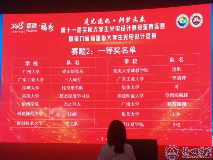 近日,第十一届全国大学生光电设计竞赛东南区赛获奖名单揭晓。我校学子与来自福建、广东、广西和海南多所高校的346支队伍同场竞技,经过现场实物竞技和方案答辩等环节,最终取得优异成绩,获得一等奖1项、三等奖2项。获得一等奖的队伍将代表我校参加全国总决赛。