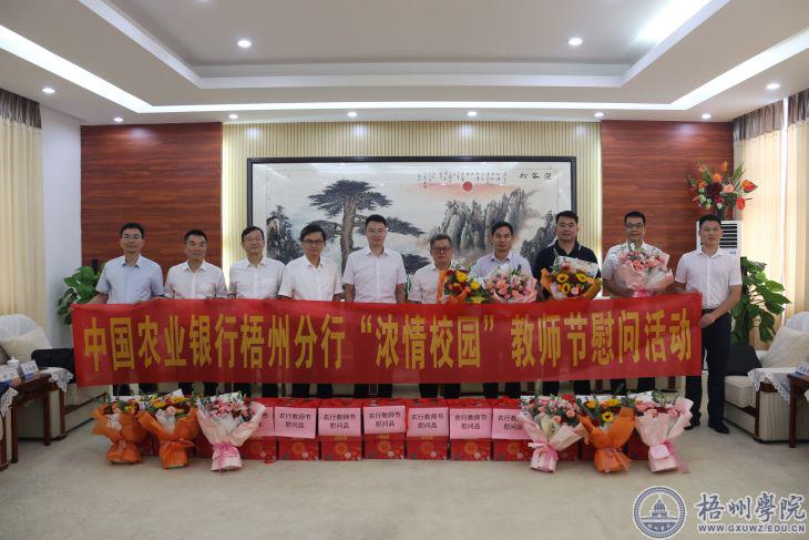 中国农业银行梧州分行办公室、信用卡与网络金融部、机构业务部、兴梧支行,学校党委(校长)办公室、财务处等双方相关部门负责人参加了慰问活动。