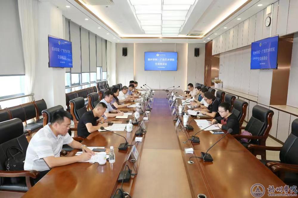 双方进行了座谈交流,伏虎副校长主持座谈会。座谈会上,侯道辉校长介绍了广西艺术学院办学规模、学科建设等情况。他指出,广西艺术学院近年来坚持打好“民族牌”“东盟牌”,在专业建设、师资队伍建设、人才培养质量等方面取得了成效,希望未来两校能够保持良好关系,深化合作,切实增强高校服务地方发展的能力。韦仕珍书记表示,希望通过双方的深入交流和研讨,加强彼此之间的了解与合作,共同服务区域经济和社会发展。杨奔校长围绕学科建设、学校发展情况作了详细介绍。