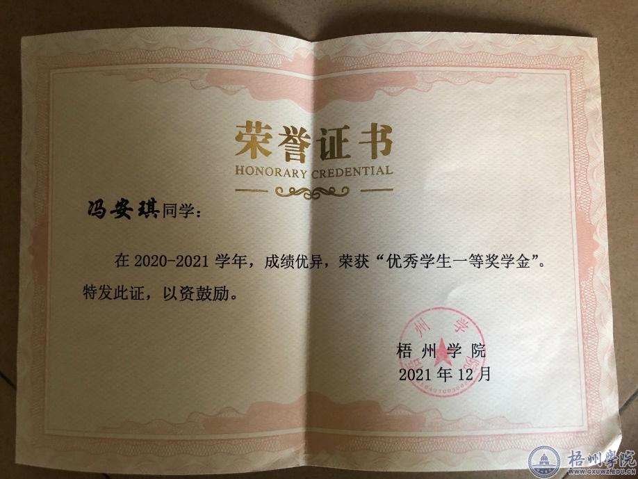 “优秀学生一等奖学金”证书