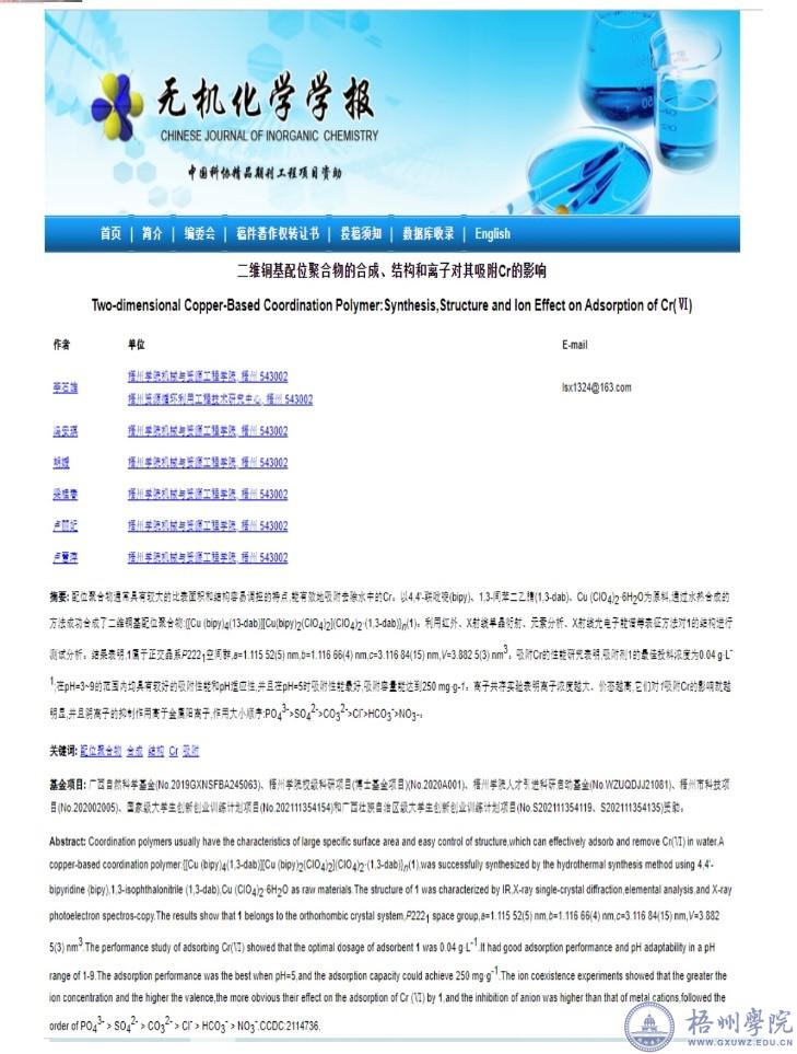 2022年以第二作者在《无机化学报》发表题为《二维铜基配位聚合物的合成、结构和离子对其吸附Cr的影响》论文