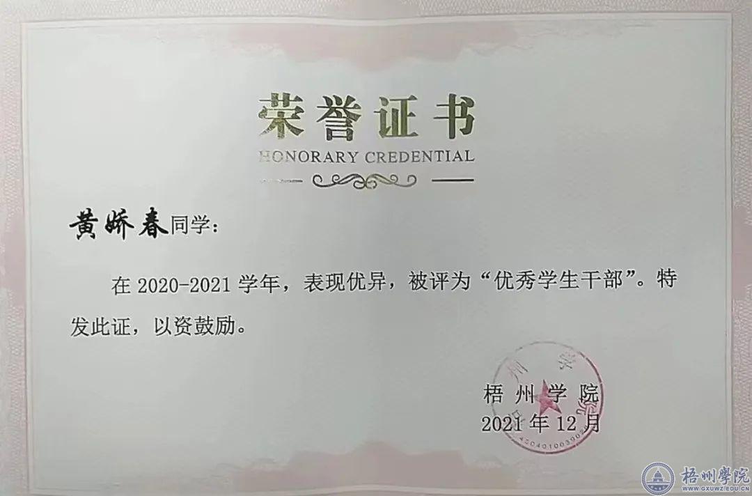 黄娇春,我校大数据与软件工程学院数据科学与大数据技术1班的学生,中共党员。2023年,她凭借着自己的不懈努力成功斩获广西区级2023年优秀毕业生。在校期间,黄娇春曾获得梧州学院“优秀党员”称号、“优秀干部”称号、“优秀团干”称号、“优秀团员”称号;两次荣获校级“三好学生”,一次获得“国家励志奖学金”。