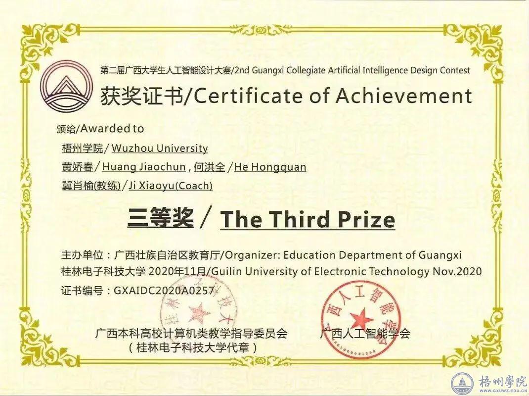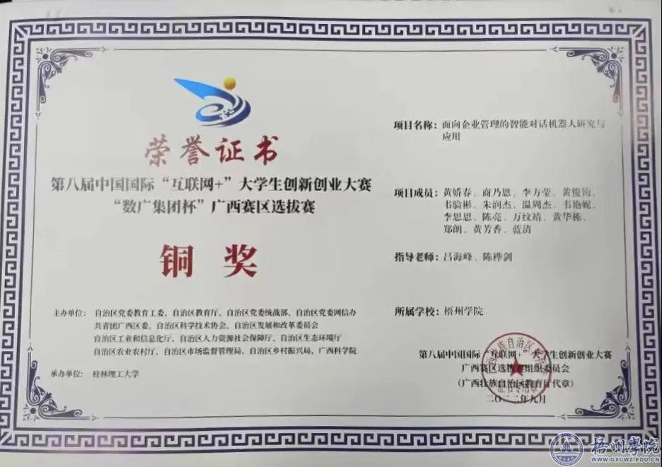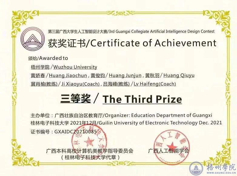 “全国大学生数据分析科普知识竞赛一等奖”“第二届广西人工智能设计大赛三等奖”“第三届广西人工智能设计大赛三等奖”“第八届互联网+创新创业设计大赛区赛铜奖”这些都是黄娇春大学四年中参加比赛所获得的“高光”时刻。