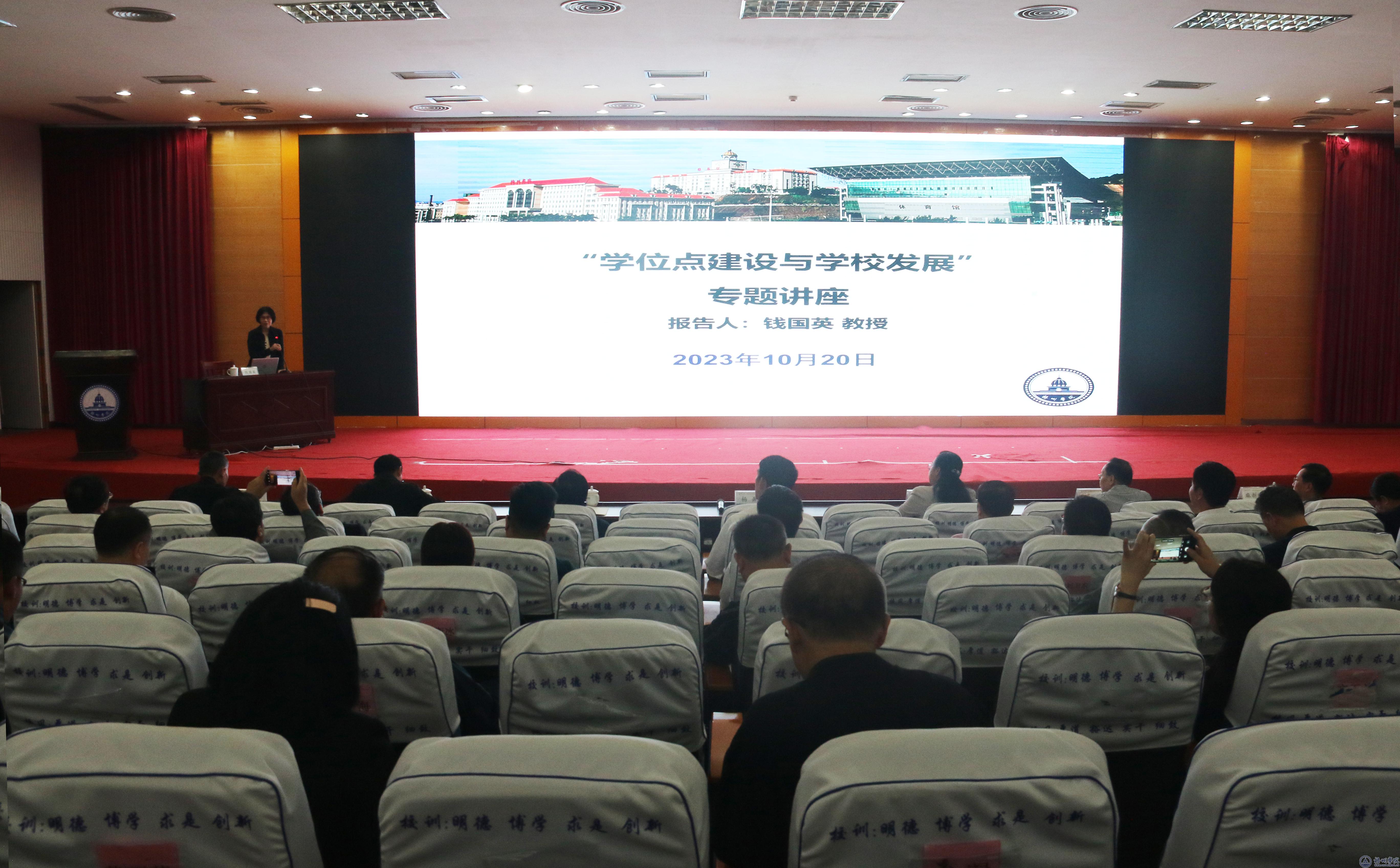 为促进学校学科、学位点建设发展,提升学校现代化治理水平,10月20日下午,学校邀请浙江万里学院副校长钱国英教授作专题讲座。讲座在明理楼一楼学术报告厅举行。学校领导韦仕珍、杨奔、梁业华、邱房贵、麻新纯、宾月景、范生汝、覃雄彪、莫晨宇;各党政管理机构、群团组织、教辅单位副科级及以上干部;各二级学院领导班子成员、办公室主任,教研室主任、行政办公室副主任、辅导员;副高级及以上教师参加讲座。讲座由校党委书记韦仕珍主持。