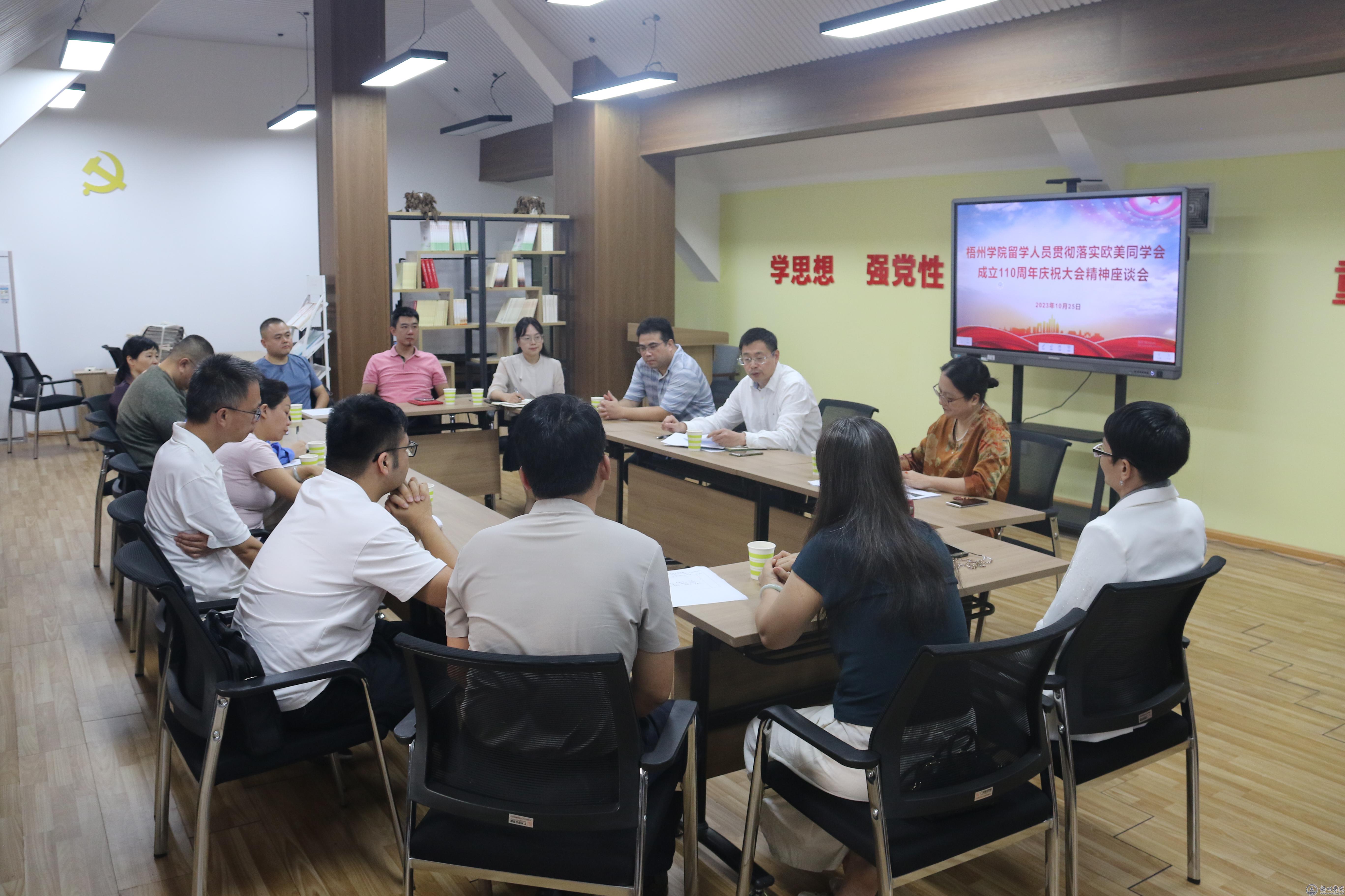 为更好引领我校留学人员围绕中心、服务大局,发挥作用、贡献力量,我校于10月25日在明理楼十楼共读书屋召开留学人员学习贯彻落实习近平总书记致欧美同学会成立110周年贺信和欧美同学会成立110周年庆祝大会精神座谈会。广西留学人员联谊会副会长,学校纪委书记、留学人员联谊会会长宾月景参加座谈会并讲话。会议由国际交流处处长、留联会副会长何恩主持。