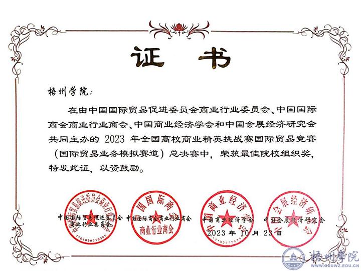 2023年10月21-23日,由中国国际贸易促进委员会商业行业委员会等部门主办的2023年(第十三届)全国高校商业精英挑战赛国际贸易赛道(国际贸易业务模拟赛道)总决赛在浙江宁波大学举行。经过3天的激烈角逐,我校三支代表队最终分别获得特等奖1项,一等奖1项,二等奖1项的优异成绩,这个成绩突破了以往历史的最好成绩,是梧州学院首次在全国商业精英挑战赛国际贸易赛道中获得特等奖、第四次获得全国团体一等奖、第四次获得最佳组织院校奖。