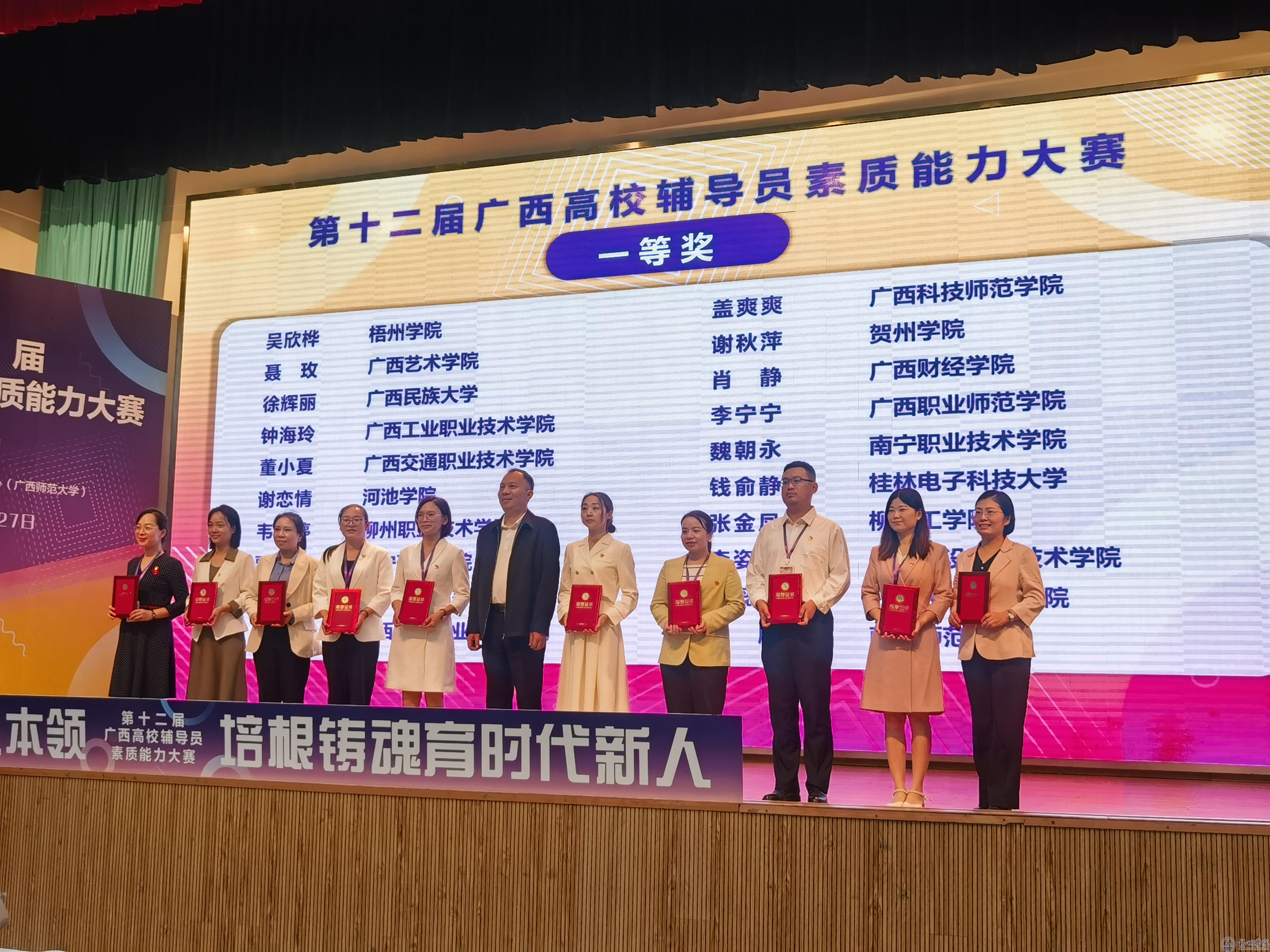 10月25-27日,第十二届广西高校辅导员素质能力大赛在桂林举行。此次大赛由广西壮族自治区教育厅主办,教育部高校思想政治工作队伍培训研修中心(广西师范大学)承办,全区各高校选拔推荐92名辅导员代表参赛。我校辅导员吴欣桦荣获一等奖。