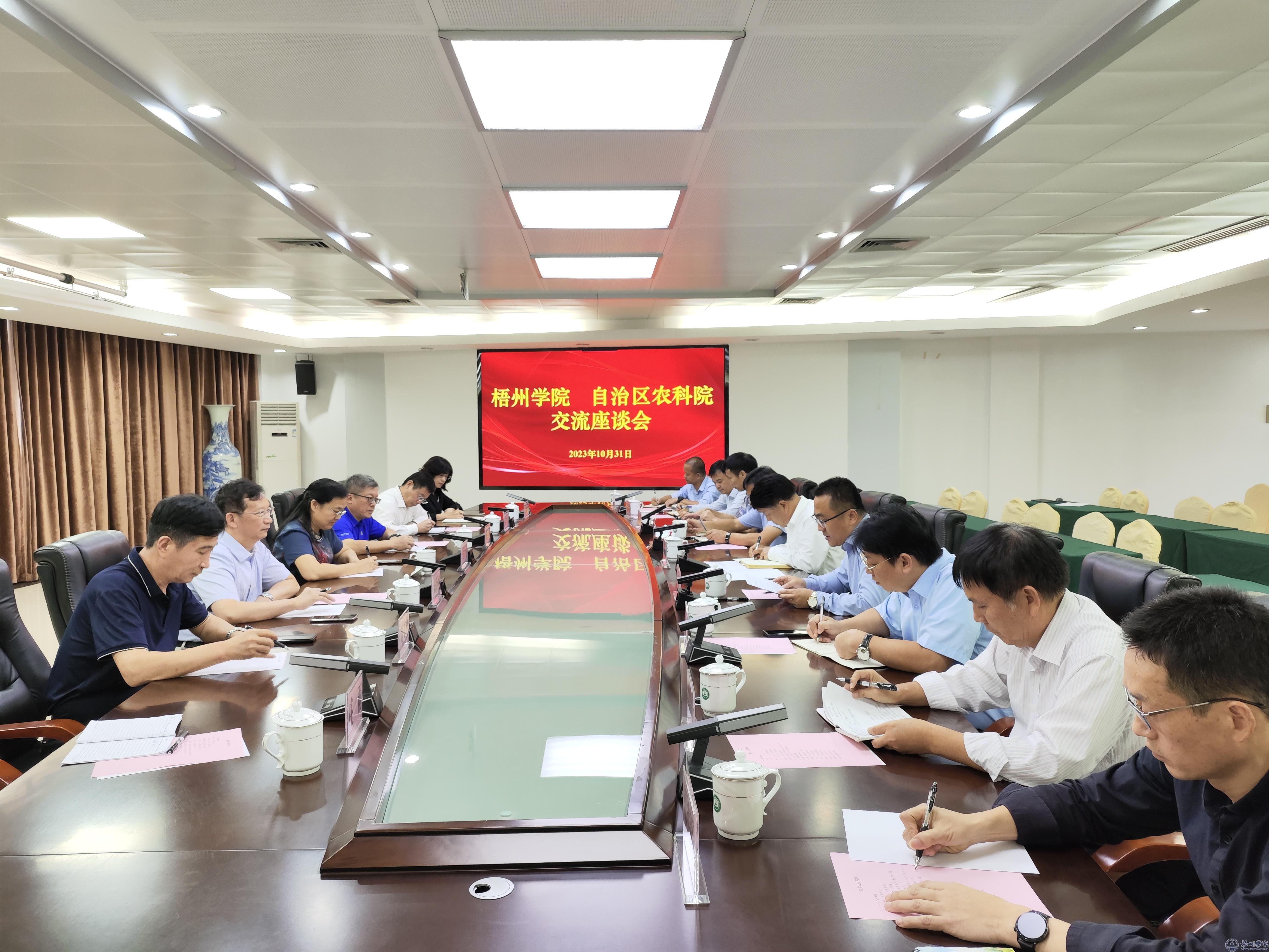 双方在农科院学术交流中心二楼会议室开展座谈。农科院邓国富书记、院长对韦仕珍书记、杨奔校长一行的来访表示欢迎,他表示农科院愿意支持帮助梧州学院的发展,在设施设备共享、人才培养、学科专业建设等方面与梧州学院开展全方位合作。韦仕珍书记在座谈中希望在科学研究及学科专业建设方面与农科院深入合作,实现共赢发展。杨奔校长表示农科院科研成果丰硕,希望学校借助农科院平台,在产学研、人才培养、服务地方发展等方面得到进一步提升。