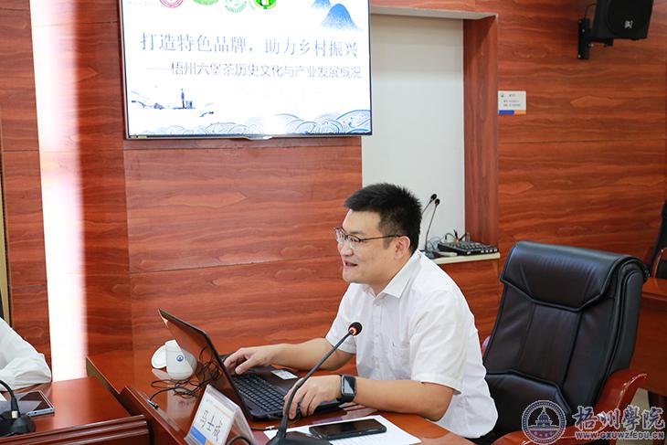 邓小林同志以《依托科技创新,为梧州六堡茶产业高质量发展提供支撑和服务》为题作中心发言,他从专业、平台、声誉、师资、科研成果等方面,通过翔实的数据对比和分析,对学校茶学科技创新现状分析作了深入剖析,在厘清技术开发和科学研究两个概念基础上,从科学基础理论和技术开发两个层面,对我校在六堡茶领域进行研究和开发可能找到的突破口进行分析和认证,并对学校六堡茶科技创新发展提出了建议。