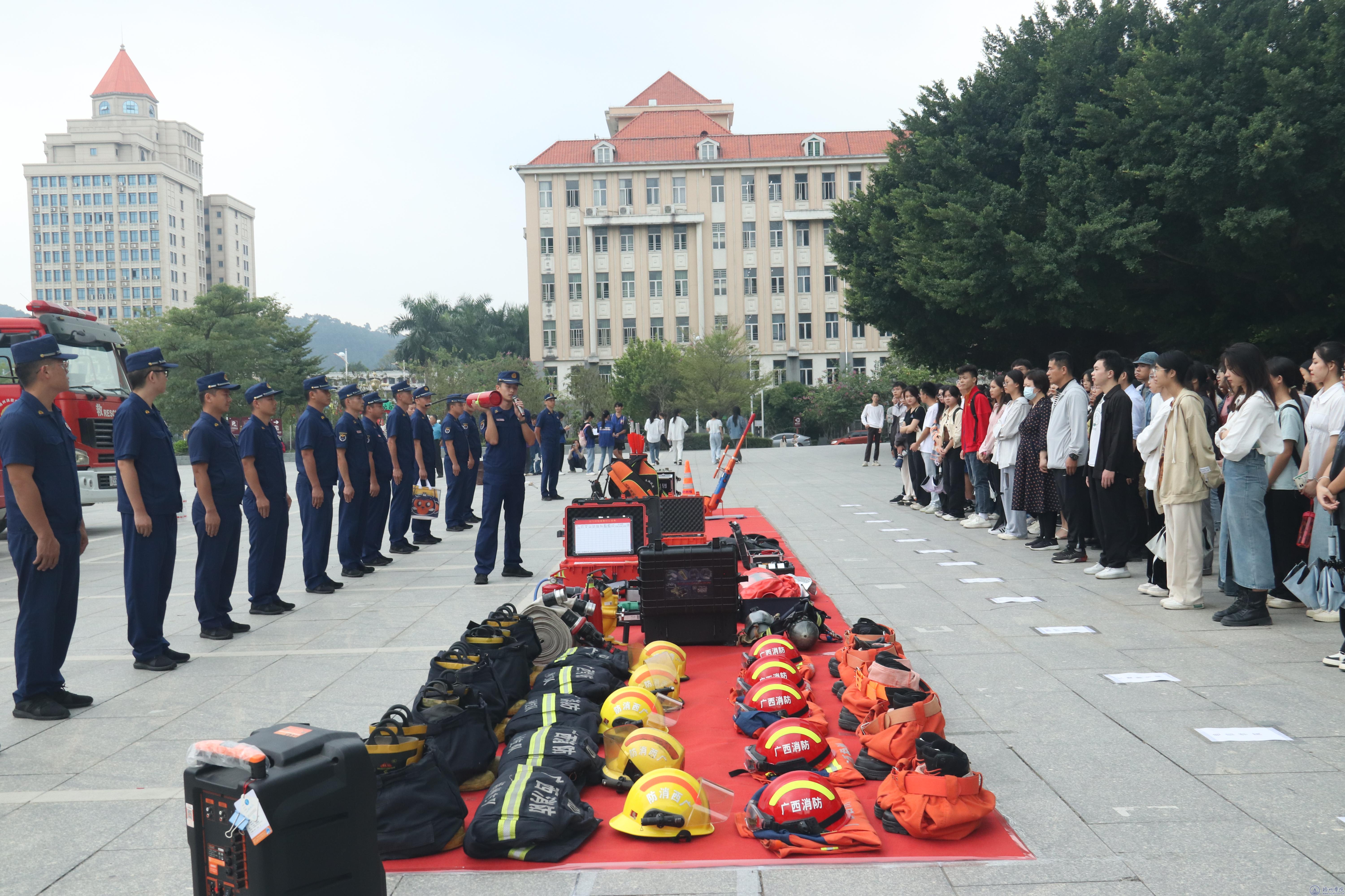 在第32个全国消防日来临之际,为进一步加强我校消防安全管理,提高全校师生消防安全意识和自防自救技能,11月8日下午,学校保卫处牵头组织开展2023年“消防宣传进校园”活动。各单位各部门教职工代表、各二级学院学生代表共500余人参加活动。