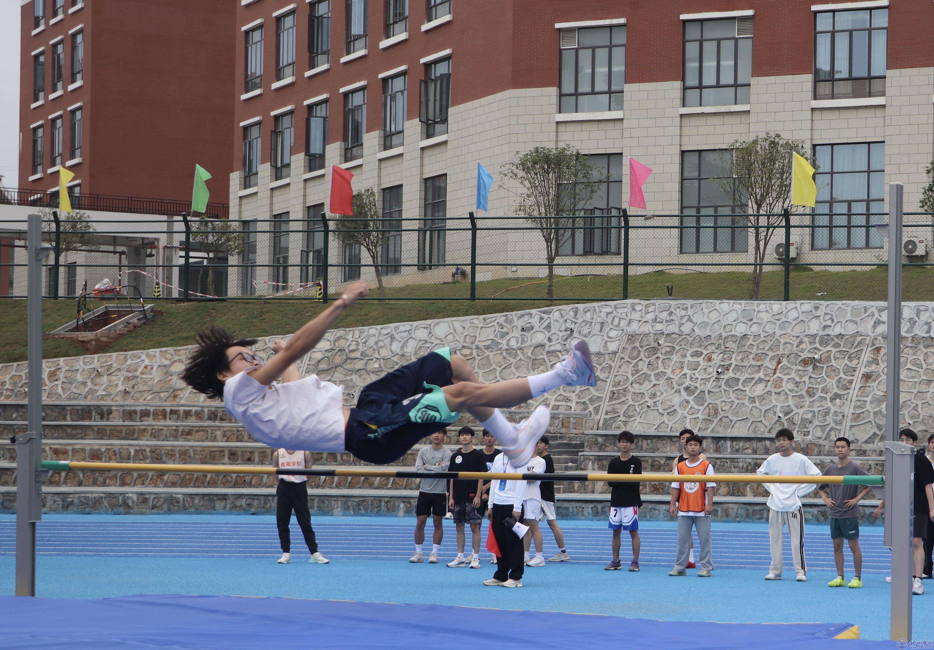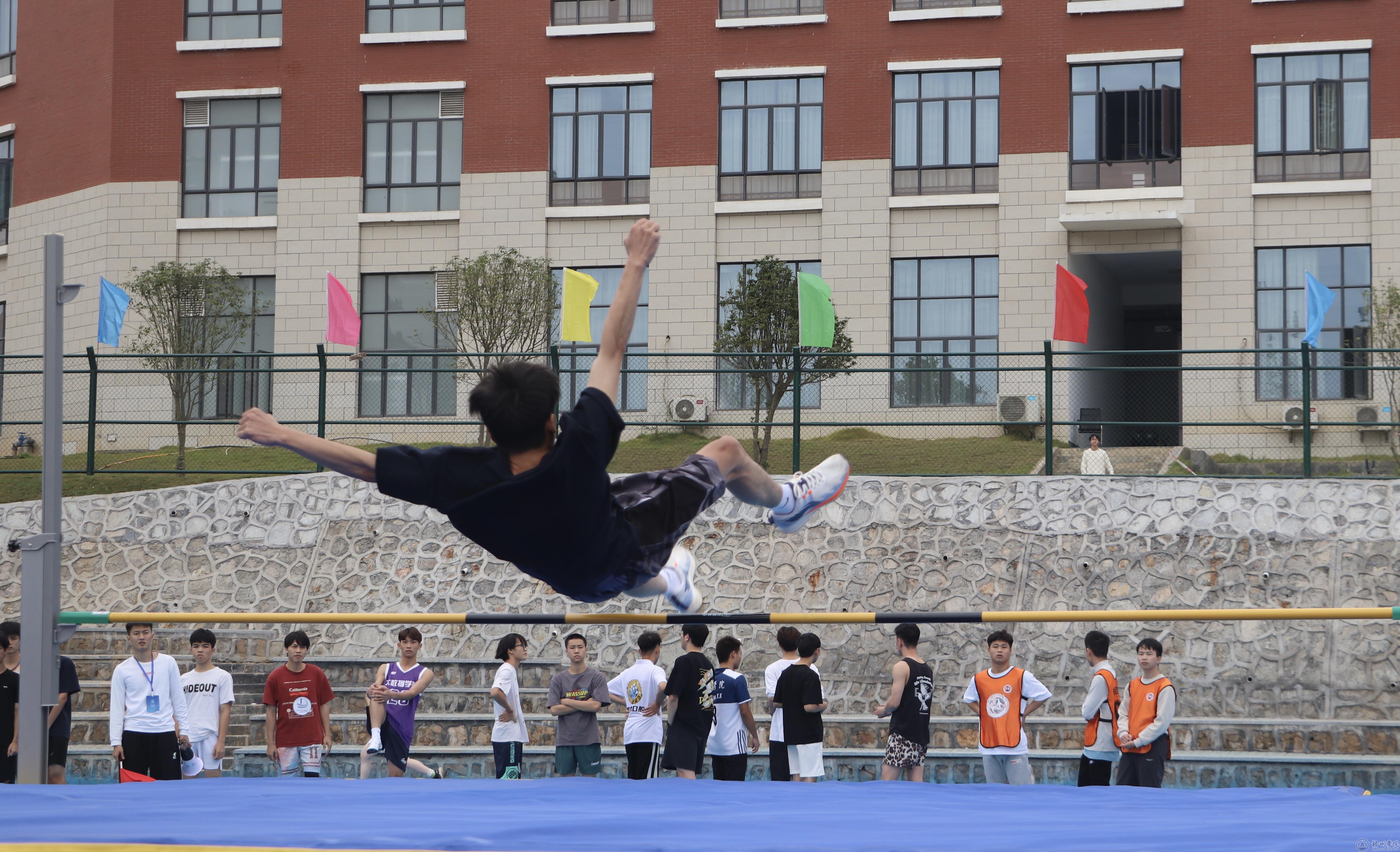 在步伐优美的助跑后,一跃,身体在空中划出一道弧线,迅速沉身,收脚。过。真是优美的跳高姿势。每一次,都是挑战,是超越。为了每一次超越喝彩。