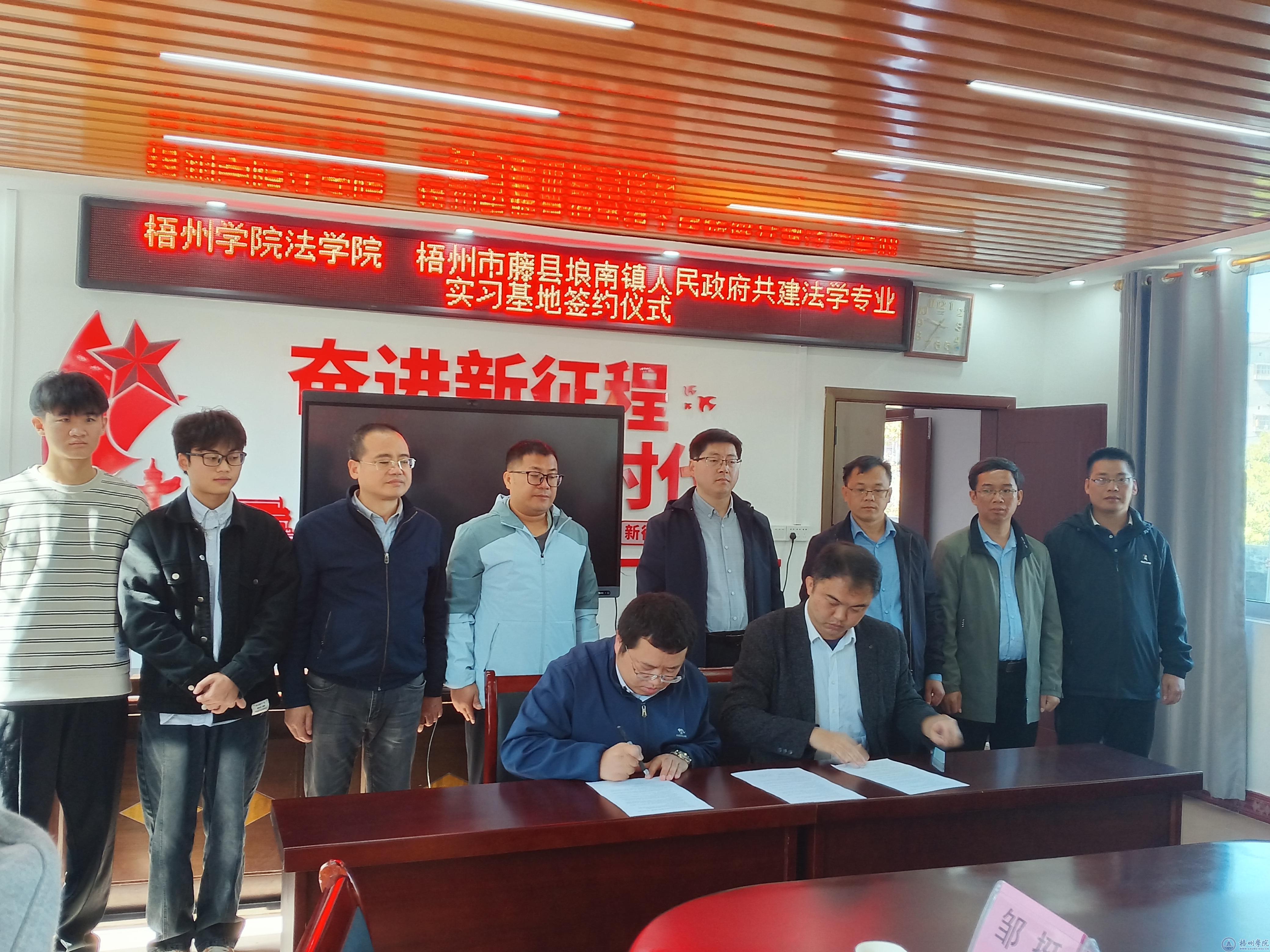 11月20日,法学院与梧州市藤县埌南镇人民政府共建法学专业协议签约仪式在藤县埌南镇人民政府举行,法学院党委副书记何剑、埌南镇党委书记马天宝及埌南镇党政班子成员、法学院教研室主任李永存博士及实习生参加了签约仪式。法学院副院长白续辉代表法学院与埌南镇人民政府常务副镇长杨宇签署并互换了协议,并授予埌南镇“梧州学院教学实验基地”牌匾,由此梧州学院法学院藤县埌南镇实习实训基地正式建立。