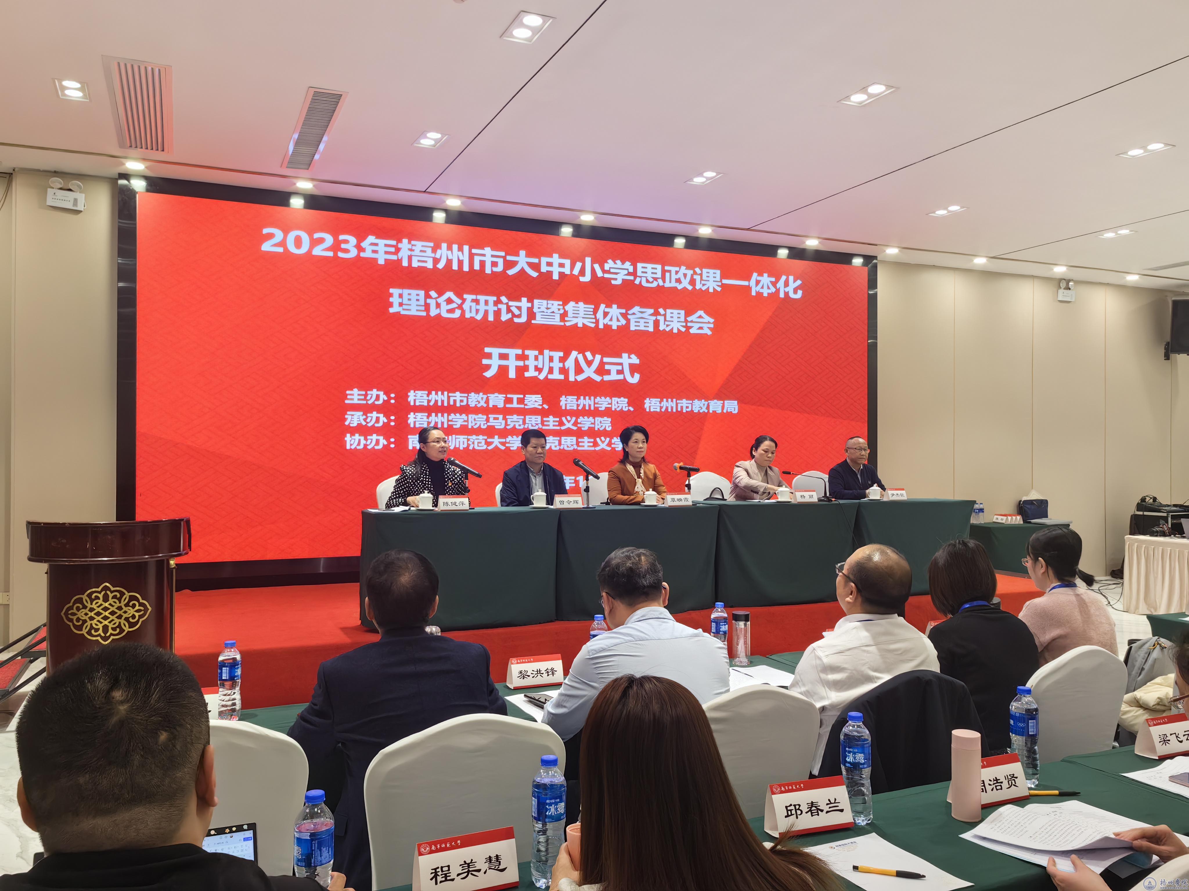 为进一步巩固梧州市大中小学思想政治理论课教育教学成果,提升全市大中小学思想政治理论课教师教育教学能力,推进新时代全市大中小学思想政治理论课一体化建设。11月21日至24日,由梧州市委教育工委、梧州学院、梧州市教育局联合主办,梧州学院马克思主义学院承办、南宁师范大学马克思主义学院协办的2023年梧州市大中小学思政课“一体化”理论研讨会暨集体备课会在南宁市成功举办。梧州市委教育工委书记、梧州市教育局党组书记、局长覃映霞,南宁师范大学马克思主义学院院长曾令辉,梧州市委教育工作委员会副书记杨丽出席仪式,全市大中小学各学段的教师代表100多人参加。开班仪式由马克思主义学院院长陈健萍主持。