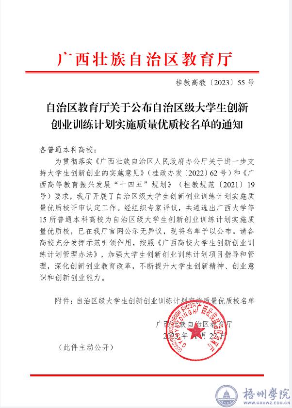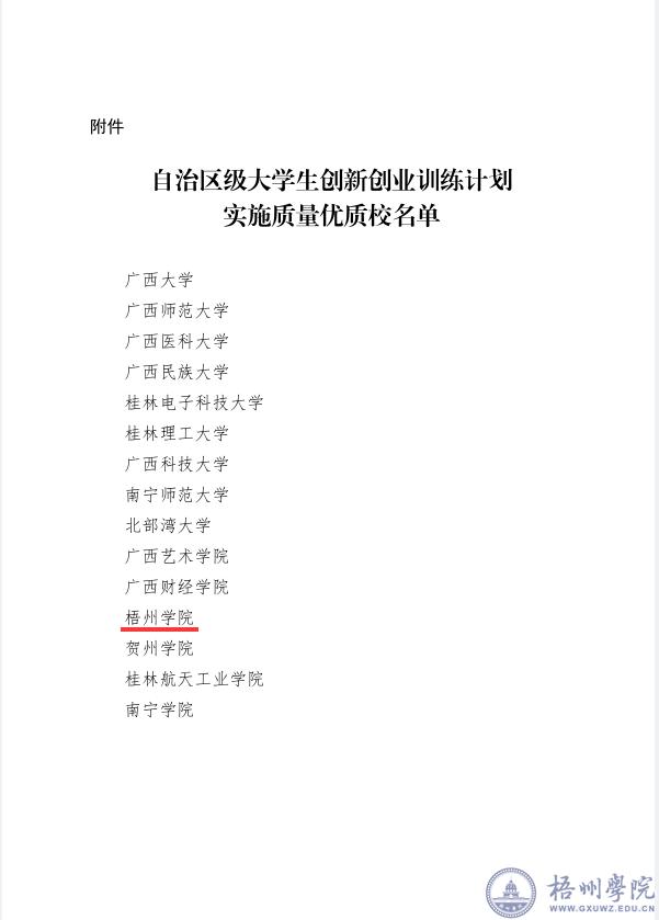 根据自治区教育厅公布的《自治区教育厅关于公布自治区级大学生创新创业训练计划实施质量优质校名单的通知》,我校成功入选“自治区级大学生创新创业训练计划实施质量优质校”名单。