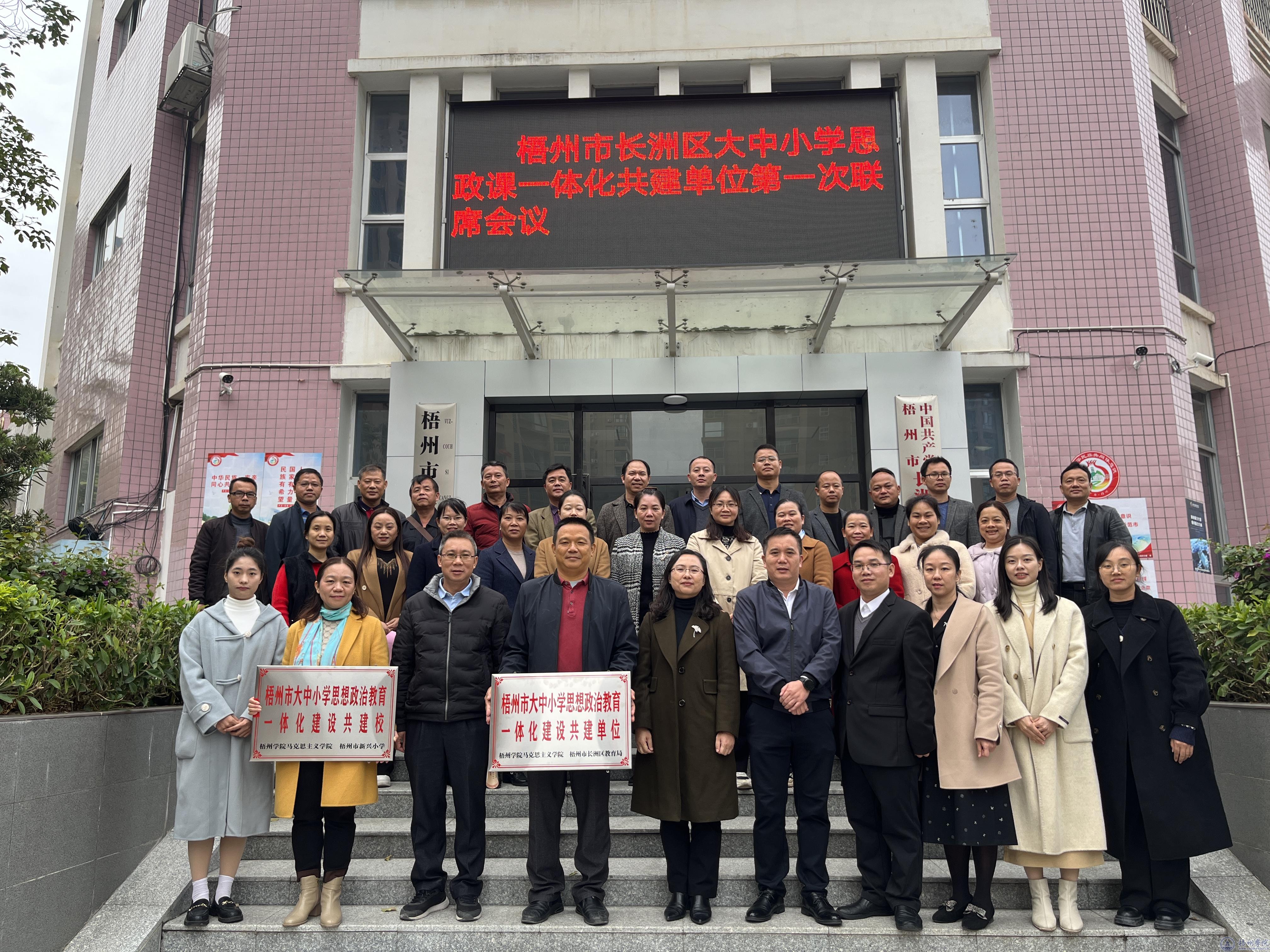 12月1日下午,梧州市长洲区大中小学思想政治教育一体化共建单位签约揭牌仪式暨共建单位第一次联席会议在长洲区教育局六楼会议室举行,马克思主义学院院长陈健萍、副院长唐景成、长洲区教育局副局长莫伟平以及有关代表参加了本次活动。