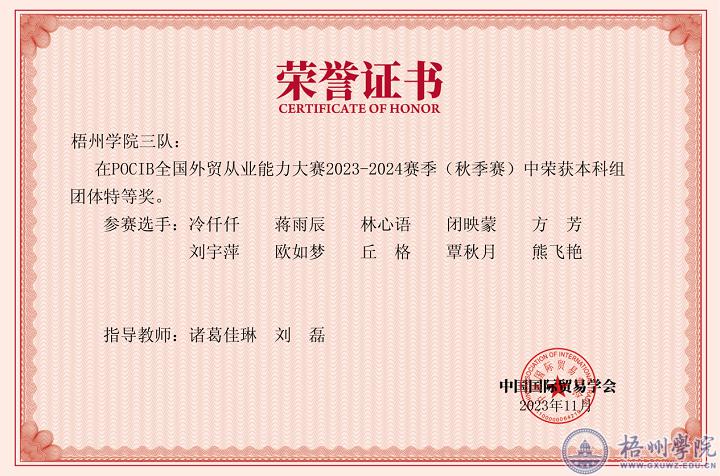 11月14日,由中国国际贸易学会主办的第十三届POCIB全国外贸从业能力大赛圆满结束,由商学院国际经济与贸易专业师生组成的4支队伍参加比赛,经过13天的激烈角逐,参赛队伍最终均取得了优异的成绩。其中,梧州学院一队和梧州学院三队荣获团体特等奖,梧州学院二队荣获团体一等奖,梧州学院四队荣获团体三等奖(具体见附图)。另外,参赛选手获个人一等奖1人、二等奖11人、三等奖15人,参赛40名学生有27人获个人奖。