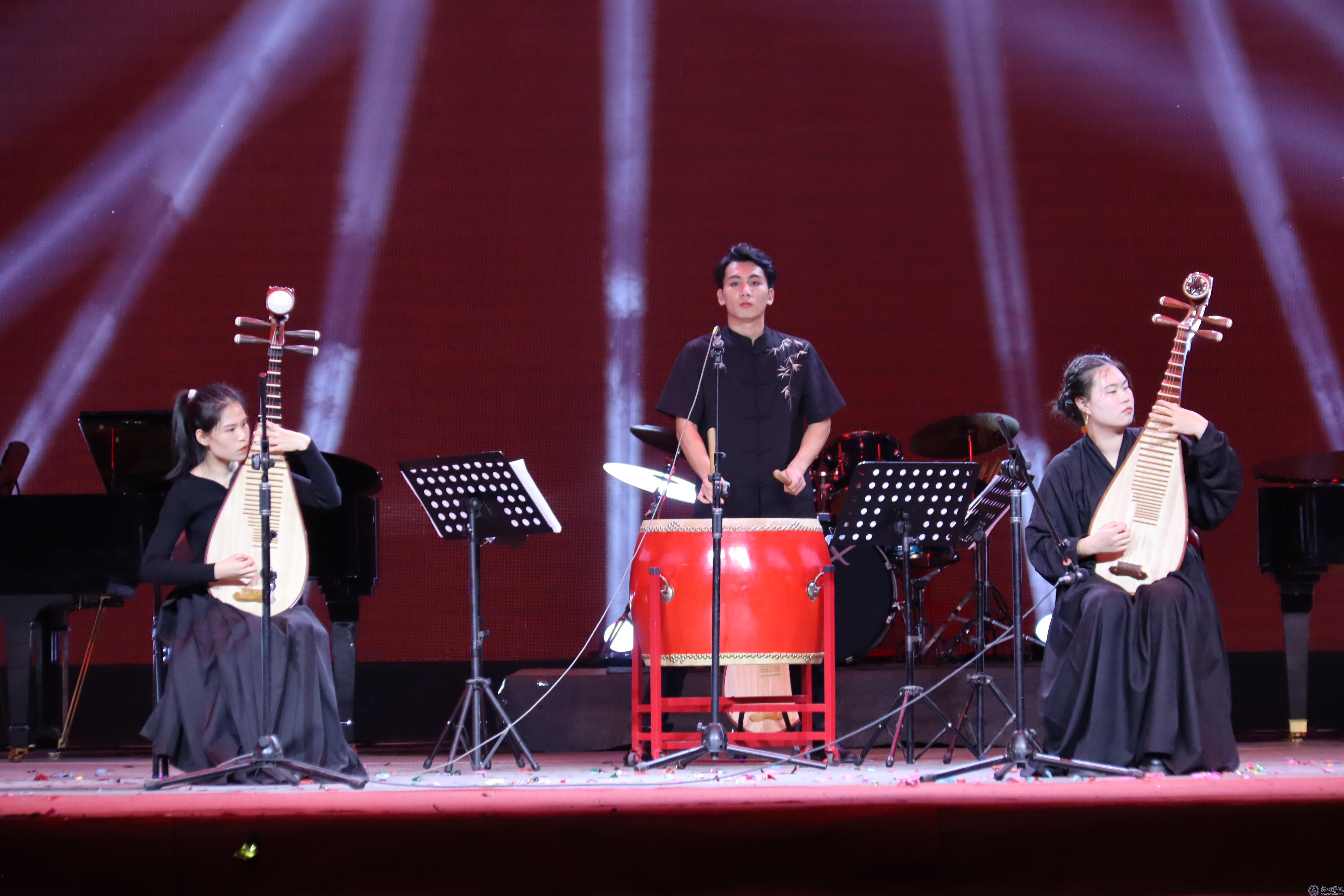聚光灯落,汇报演出在破阵子乐队《霍元甲+菊花台+女儿情》极具中国风的歌声中正式拉开帷幕;一曲《最美的太阳》燃动全场,男女生对唱,尽显歌唱技巧之高超;二胡的悠扬缠绵交织着钢琴的清脆乐律,《风居住的街道》一曲此时化成风般吹入现场观众耳中;民歌串烧《水韵》的乐声如水般蜿蜒不断,暗喻着中国民歌的源远流长、不断发展;钢琴民乐《欢沁》将钢琴、琵琶、笛子三者结合,俏皮活泼,欢乐情绪沁入现场观众心扉;“人生难得是欢聚,惟有别离多”,《城南送别》歌声响起,引得现场毕业离别愁绪愈浓;双钢琴叠加马林巴、小军鼓、铃鼓等打击乐器,《节日曲》形式新颖、旋律欢快;中场舞蹈串烧青春气息四溢,舞者们朝气蓬勃,;热情洋溢的民族管弦乐《金蛇狂舞》仿佛将人带入到了欢腾的节日场景中;小品《斗琴》以幽默的形式再现了音乐学专业学子们平日的练琴日常;歌舞《奇迹再现》气势十足,曲调激荡人心;琵琶齐奏《霸王卸甲》生动演绎了项羽的英雄悲剧;阵阵葫芦丝声清轻淡雅,丝丝入扣,《月光下的凤尾竹》一曲使人仿佛置身于绿意盎然的竹林中;歌剧《灿若星辰的目光》在歌声中将水红莲与秦啸生的爱情故事娓娓道来,表达了对爱情的美好向往;钢琴协奏《圣诞快乐劳伦斯先生》的音乐精神直击心灵,不断鼓舞着音乐学子们;大合唱《稻香》《那些年》以歌声为载,四年大学生活一幕幕在眼前闪过。