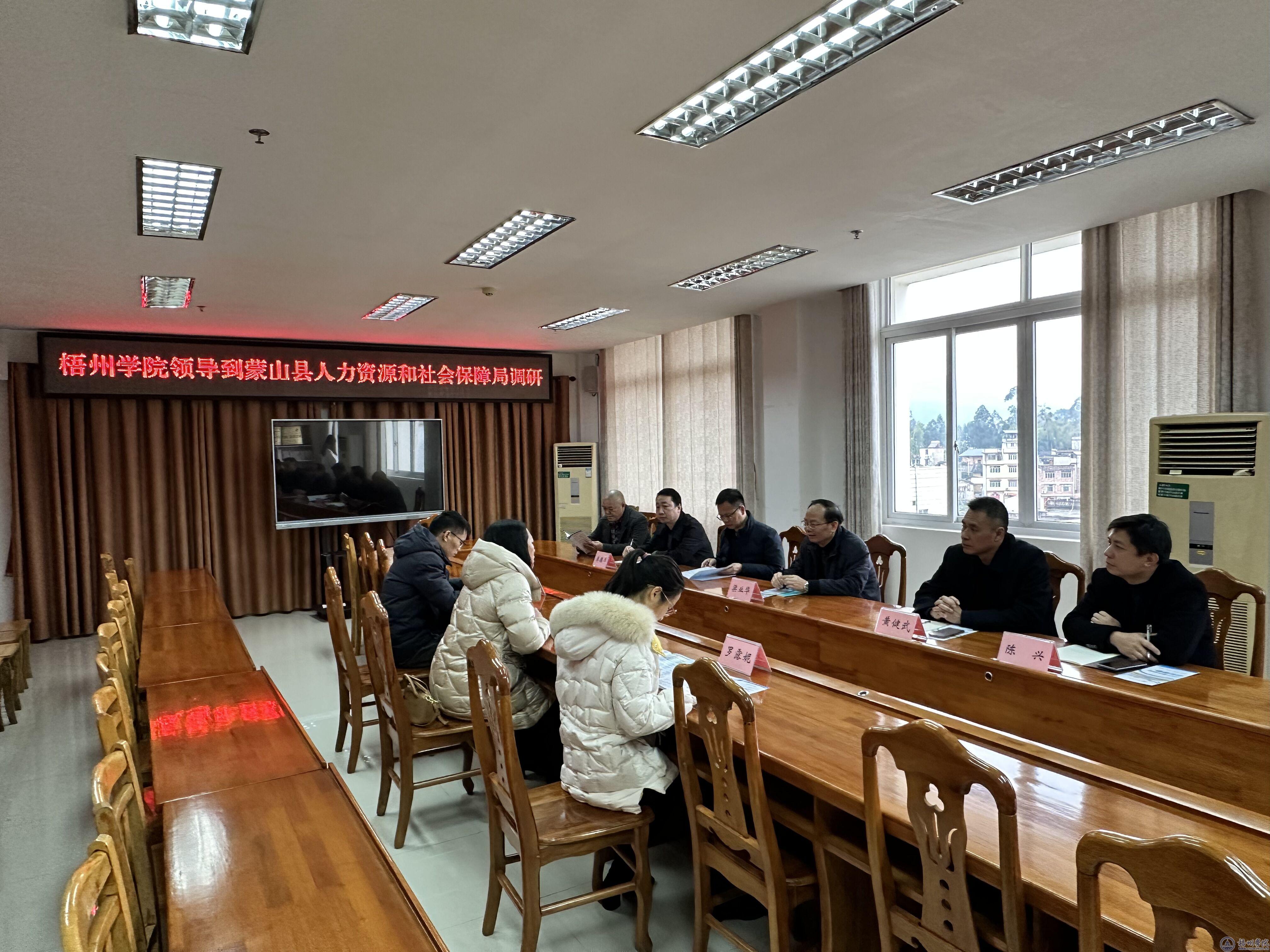 调研组首先到蒙山县人力资源和社会保障局进行座谈,了解蒙山县人才市场需求情况,双方围绕人才培养、就业创业和产学研一体化等方面进行了深入的交流和讨论。梁业华副书记强调,继续加强与企业的联系与合作,共同推动产学研一体化进程,优化人才培养模式,加强实践教学环节,为地方经济和社会发展做出更大的贡献。