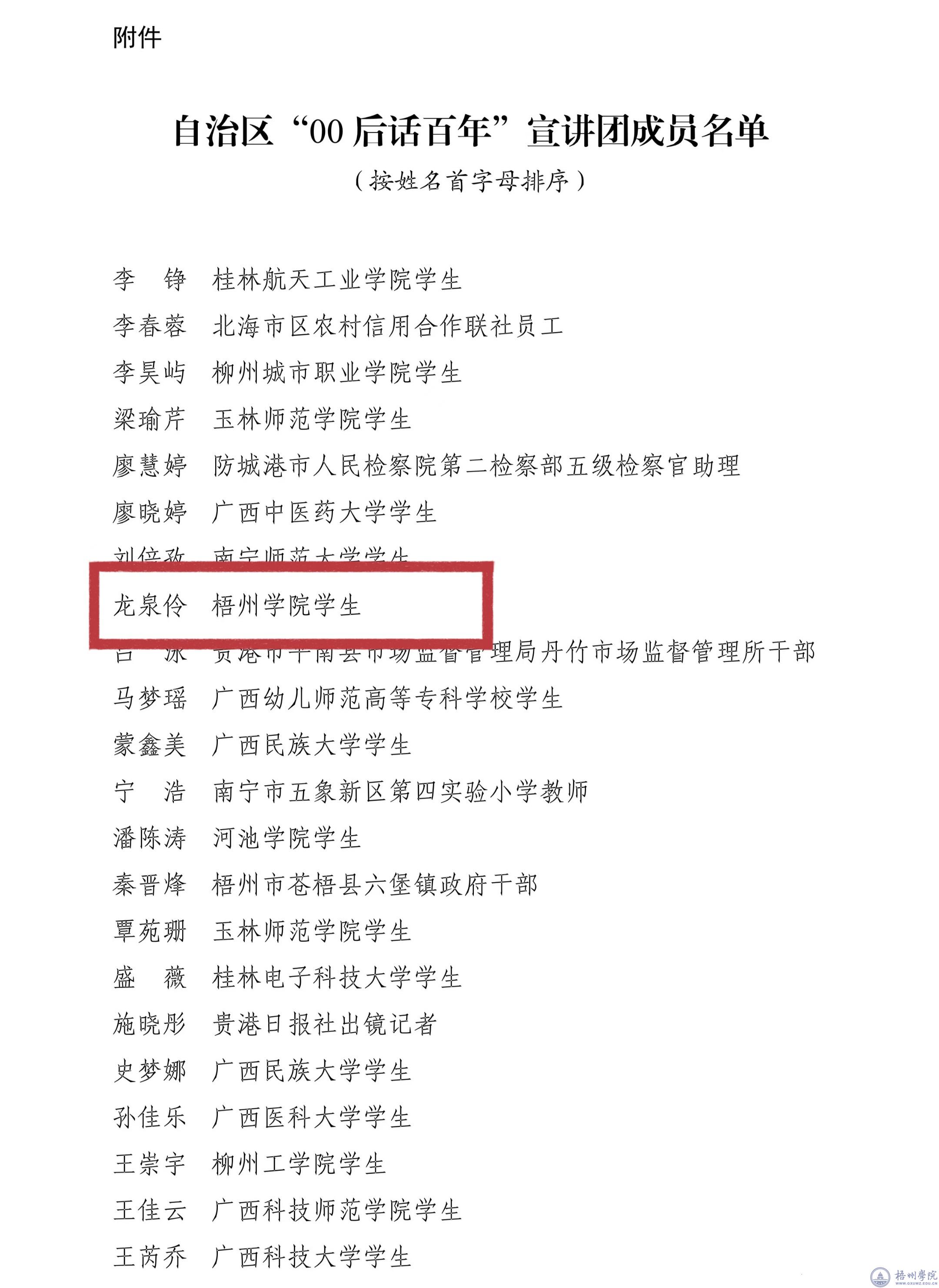 近日,自治区党委宣传部、自治区党委讲师团公布了自治区“00后话百年”宣讲团成员名单,我校思想政治教育专业2021级学生龙泉伶入选自治区“00后话百年”宣讲团。