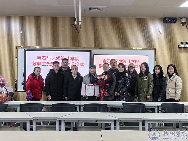 为进一步增强退休教职工的荣誉感、归属感和幸福感,不断提升教师队伍凝聚力、向心力,近日,宝石与艺术设计学院在明理楼中楼303智慧教室,举行了教职工光荣退休仪式,欢送容绍鹏同志光荣退休。宝石与艺术设计学院党委书记钟海明,院长贠禄,副院长吴海彪、黄璜,服装与服饰教研室教师代表参加仪式。