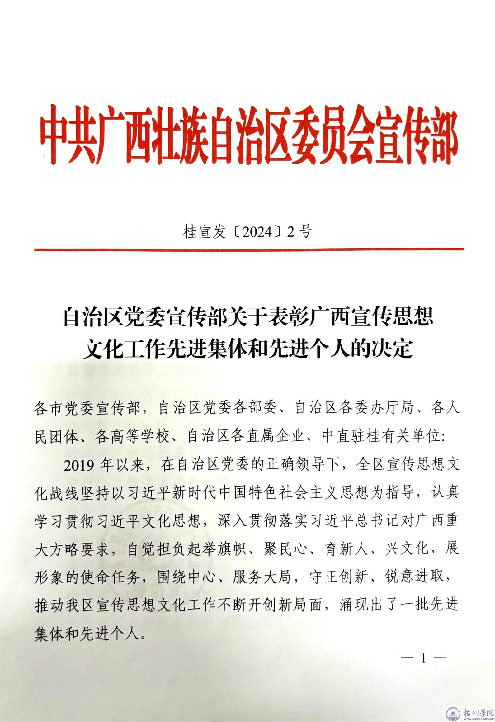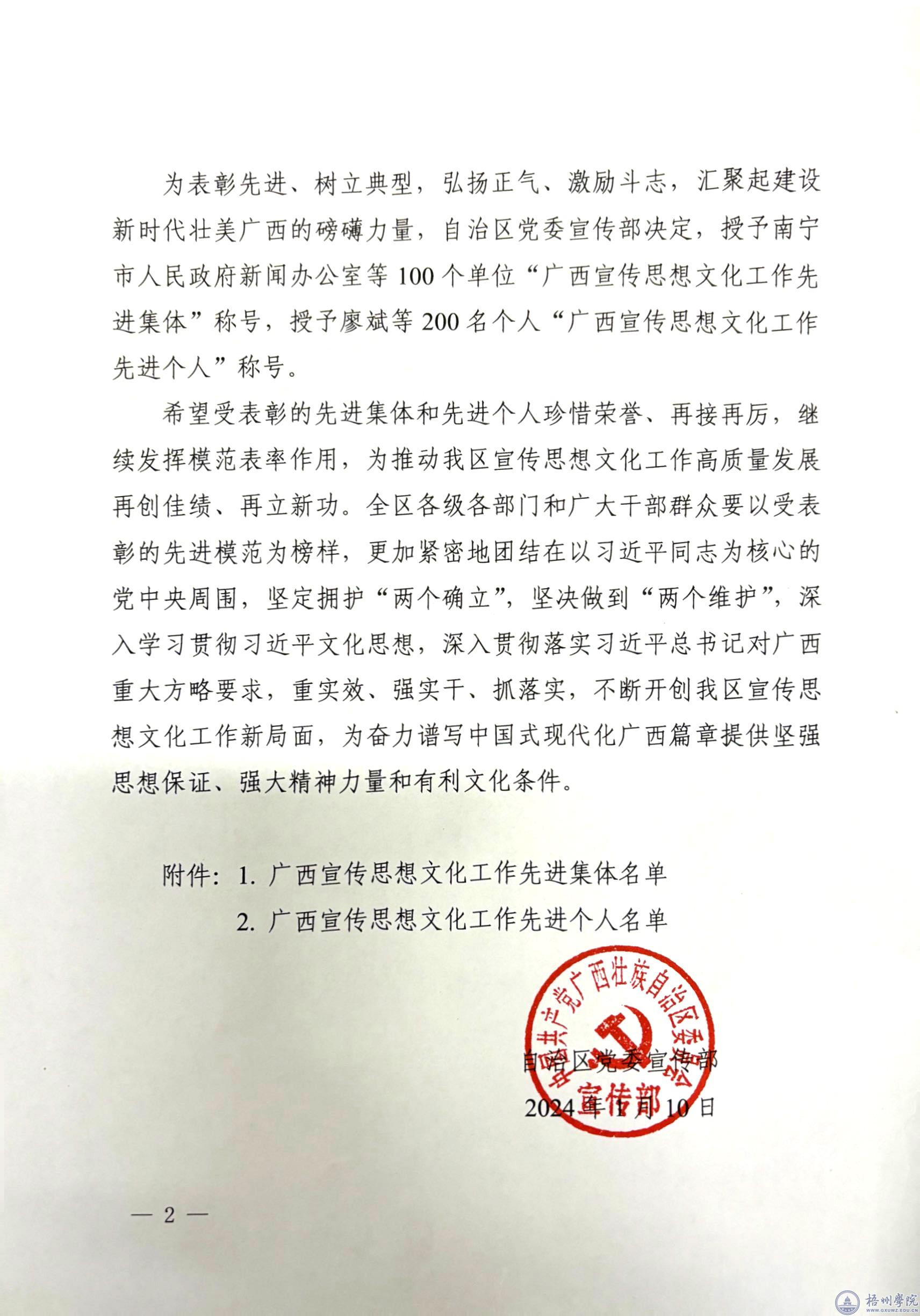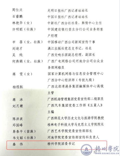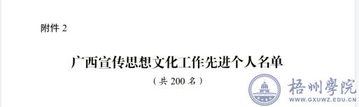 根据自治区党委宣传部《关于表彰广西宣传思想文化工作先进集体和先进个人的决定》精神,为表彰先进、树立典型,汇聚起建设新时代壮美广西的磅礴力量,自治区党委宣传部决定授予100个单位“广西宣传思想文化工作先进集体”称号,授予200名个人“广西宣传思想文化工作先进个人”称号,我校团委书记秦伟荣获广西宣传思想文化工作先进个人称号。