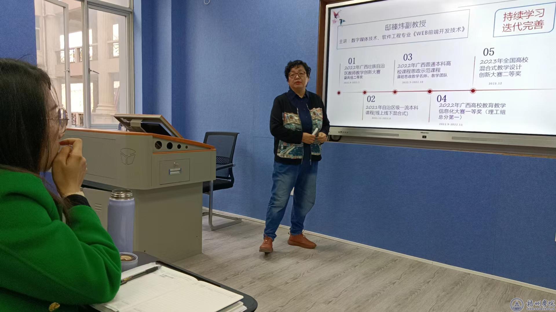 宋银秋教授以其亲自指导建设的《WEB前端开发技术》课程为例,展现该课程从区教师教学创新大赛到区级一流本科课程、直至全国高校混合式教学设计创新大赛“持续学习、迭代完善”的创建历程。对照一流课程评审指标,根据“好课”的判断标准,详细分析课程内容的重构,教学方法的创新,教学环境的创设,教学评价的改革等教学要素之间的关系,并从课程目标可衡量,体现“两性一度”的要求,就痛点问题精准凝练、 教学改革创新、解决痛点问题,促进课程目标、学习目标达成,以及如何体现““学生中心”理念的内涵,展现了其先进的教学理念。最后,教师们提出了碰到的问题难题,宋院长也一一给予详细解答。