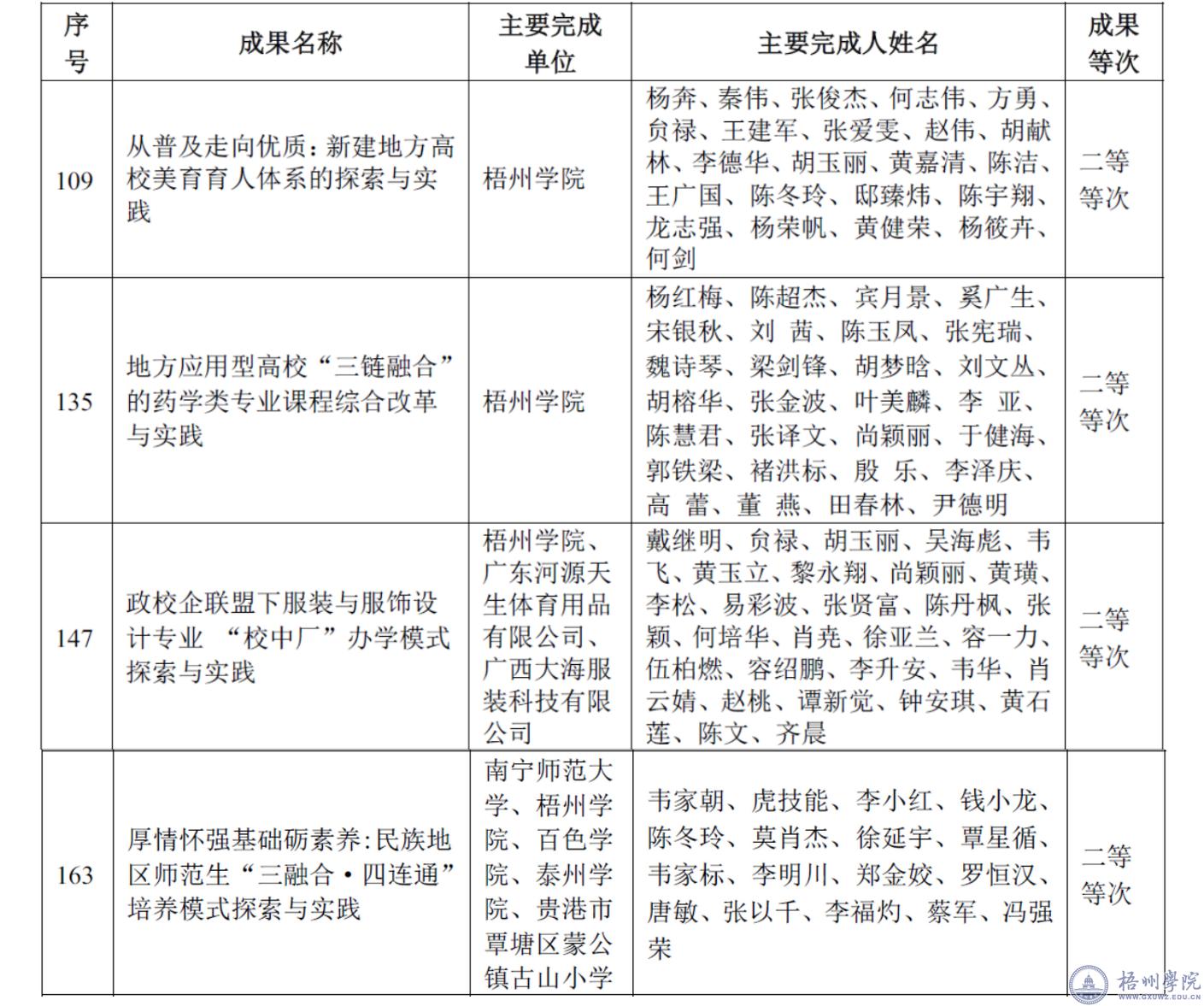 根据《自治区教育厅关于公布2023年广西高等教育自治区教学成果等次评定结果的通知》(桂教高校〔2024〕4号),我校作为第一主要完成单位有3项教学成果获2023年广西高等教育(本科)自治区级教学成果奖二等等次,分别是:《从普及走向优质:新建地方高校美育育人体系的探索与实践》《地方应用型高校“三链融合”的药学类专业课程综合改革与实践》和《政校企联盟下服装与服饰设计专业“校中厂”办学模式探索与实践》。此外,我校作为第二主要完成单位参与的校外教学团队《厚情怀强基础砺素养:民族地区师范生“三融合·四联通”培养模式探索与实践》获二等等次。