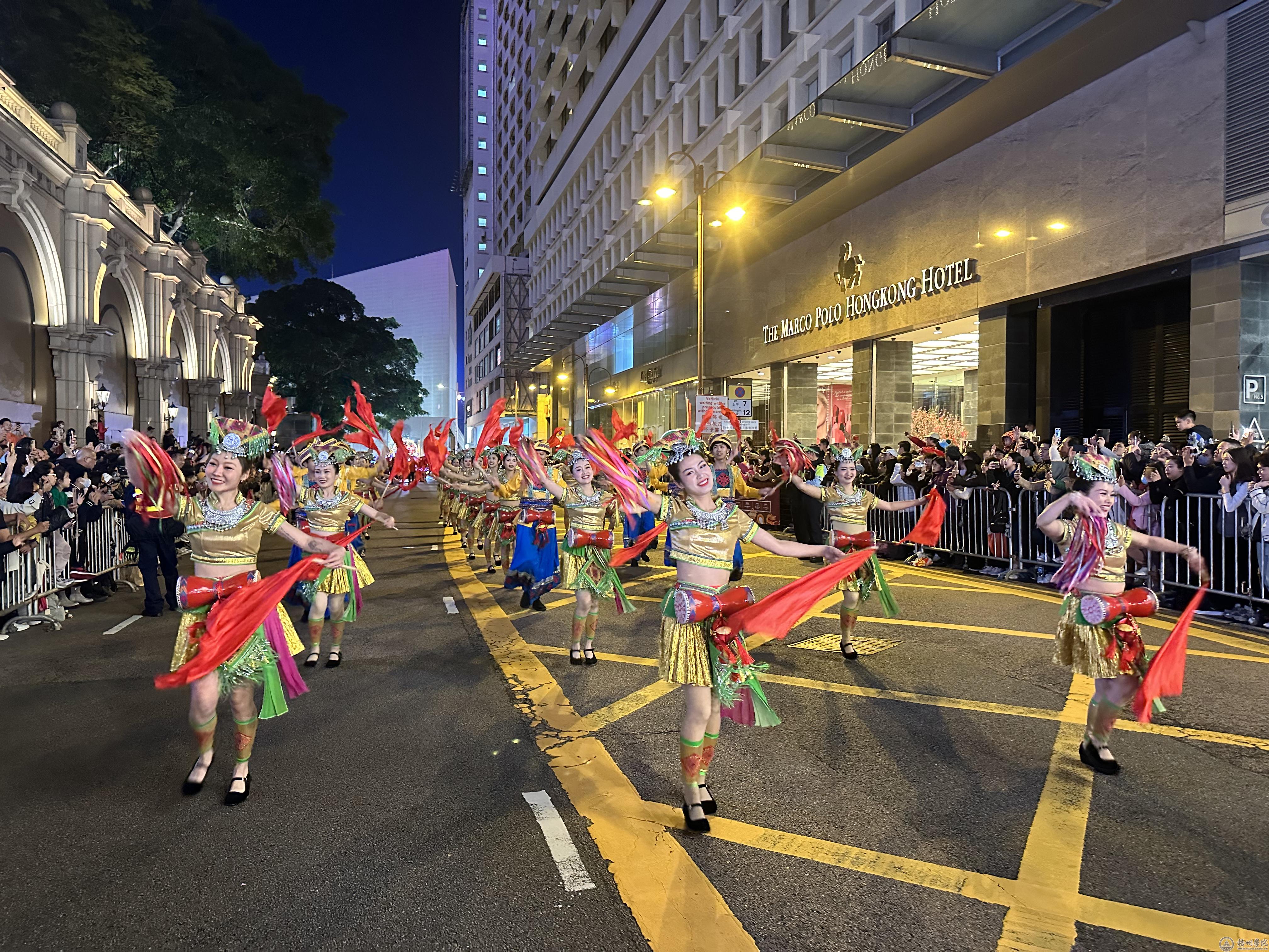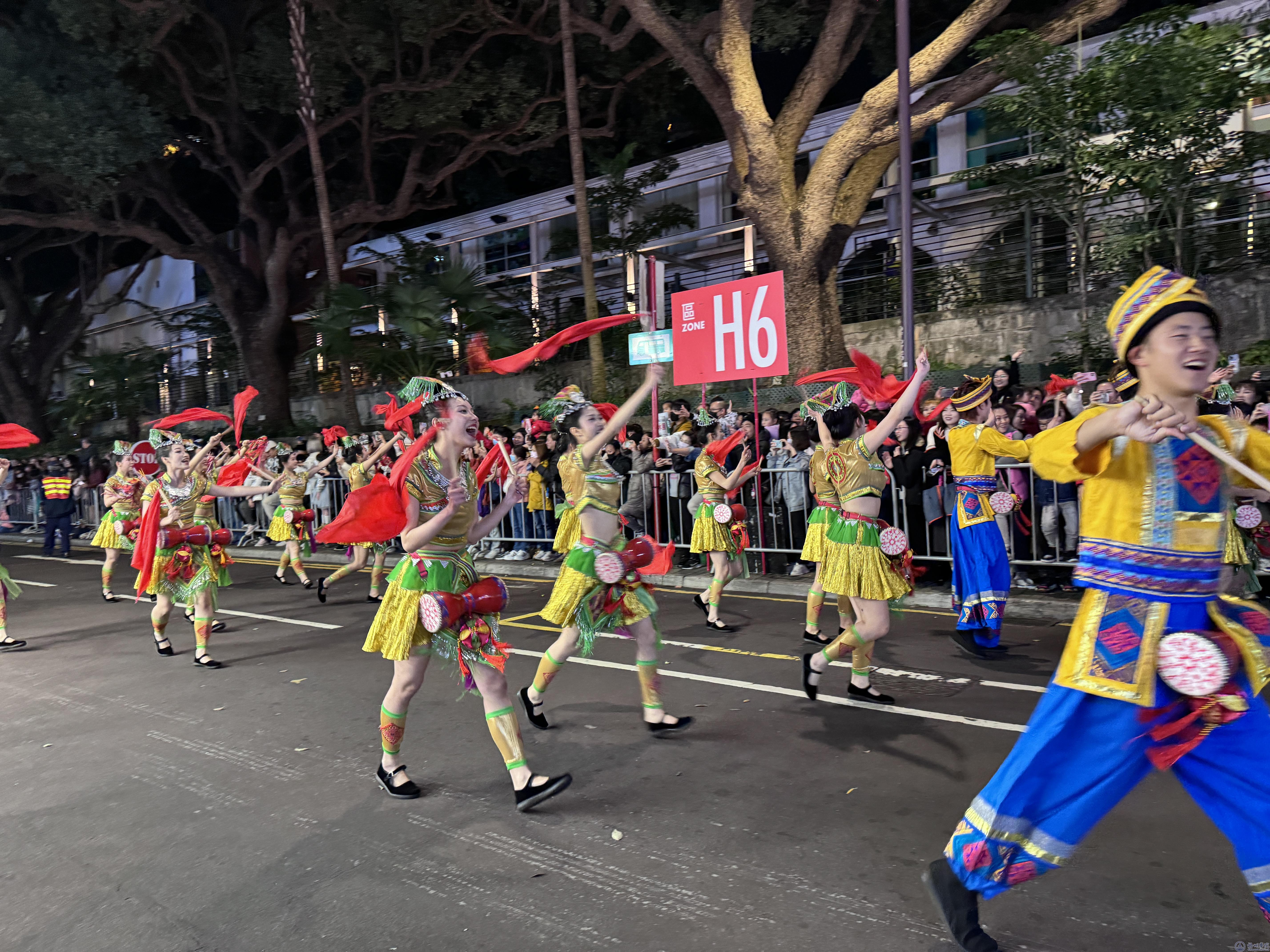 2月10日(农历大年初一),香港城中热闹非凡,年味十足,艺术团参加了开幕式以及主题花车巡游表演,为香港市民带来了精心编排的舞蹈《山歌好比春江水》。“唱山歌咧……这边唱来那边和,山歌好比春江水咧,不怕滩险弯又多……”,当耳熟能详的旋律响起,演员们身着壮族传统服饰,挥动尼呀彩带和绣球,敲击壮族蜂鼓,用热情奔放的山歌和动感明快的舞蹈,充分展示八桂大地秀美如画的青山绿水、深厚浓郁的民族文化底蕴、以歌传情达意的独特魅力,表达了新时代壮美广西人民幸福快乐的美好愿景,引起了现场观众的广泛共鸣。艺术团还将参加2月11日、12日系列汇演活动。