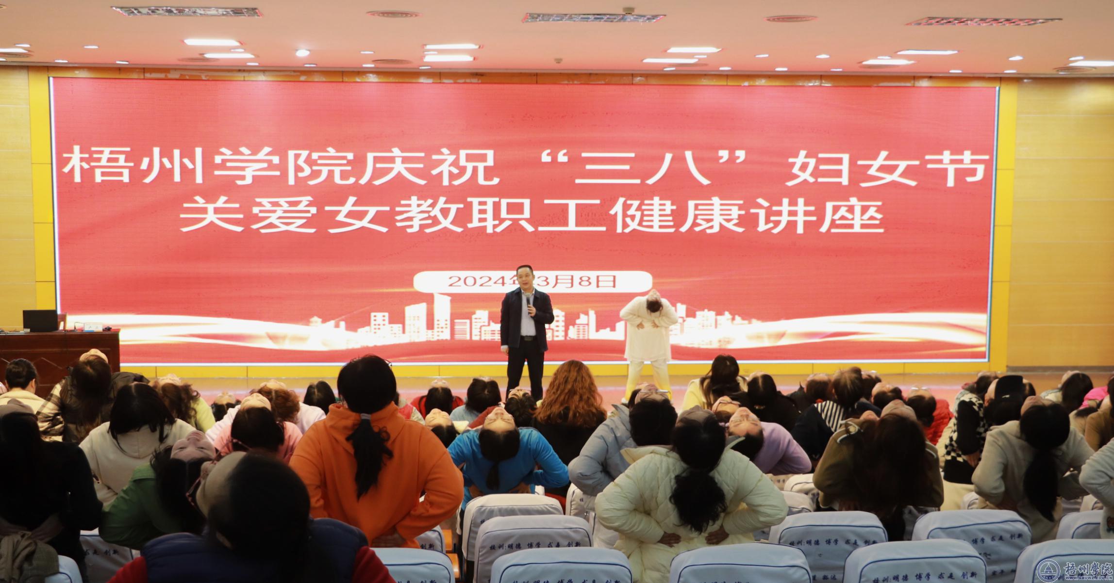 本次活动分为集体健身操活动、校园健步走活动、健康讲座三个部分。健美操活动中,随着欢快的音乐响起,女职工们一个个精神饱满,灵敏跃动,在欢快的节拍中尽情展示巾帼风采。校园健步走活动中,全体女教职工分成四列纵队,高举“梧院巾帼”红色旗帜,奋勇争先阔步向前。大家一边健步走,一边欣赏校园春光,由北校区运动场出发,沿北校区食堂、北校区宿舍、风羽球馆,行进至明理楼一楼学术报告厅,一路欢声笑语,气氛热烈。梧州市中医医院院长卢正以题为《女神中医调护课堂》为女职工们开展中医养生保健讲座。卢正院长带领女职工们进行八段锦训练,并准备了特制的锦囊,梧州市中西医结合医院医药的医师团队为大家准备了各色各样的药膳汤等美食,现场其乐融融,气氛热烈。