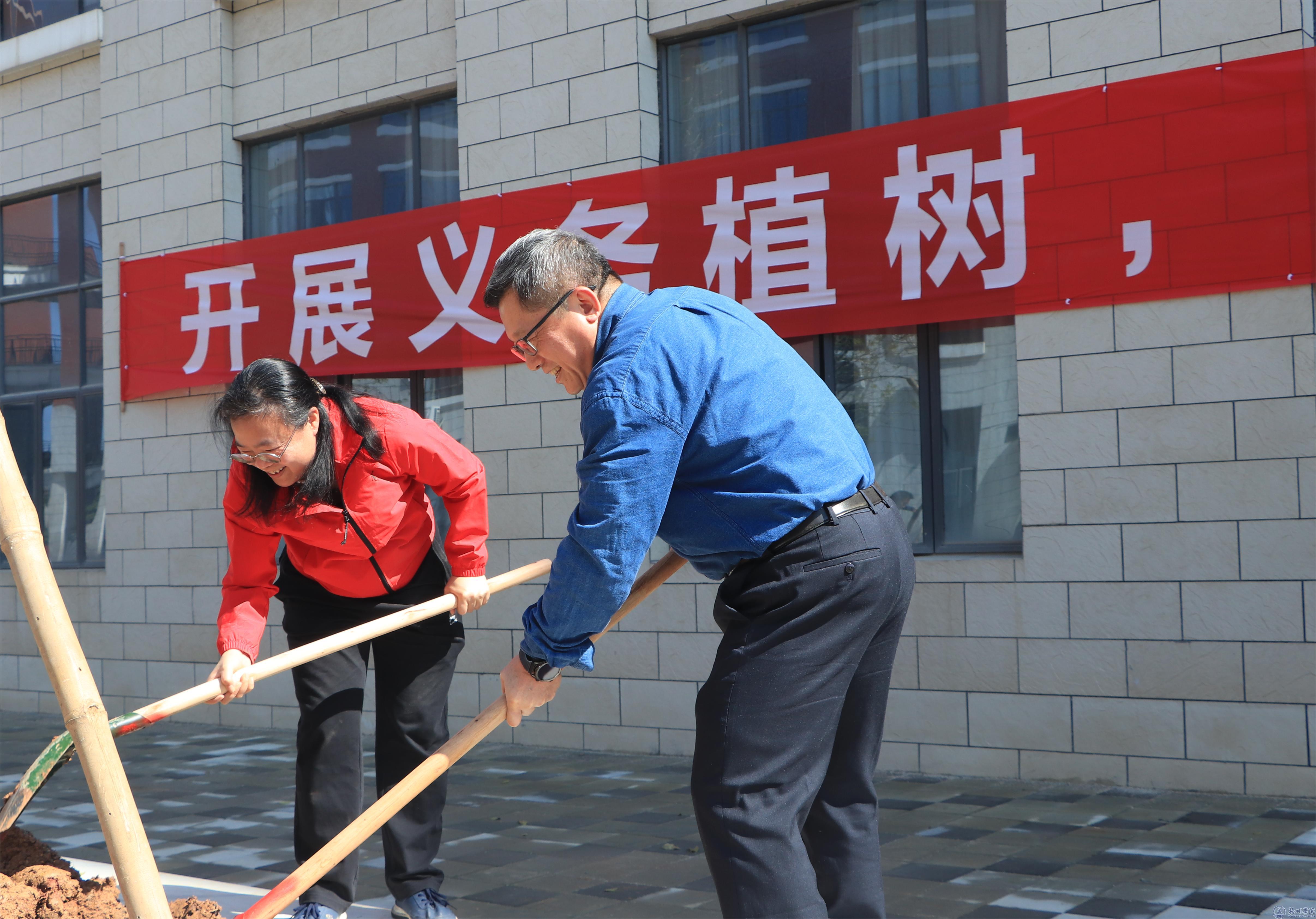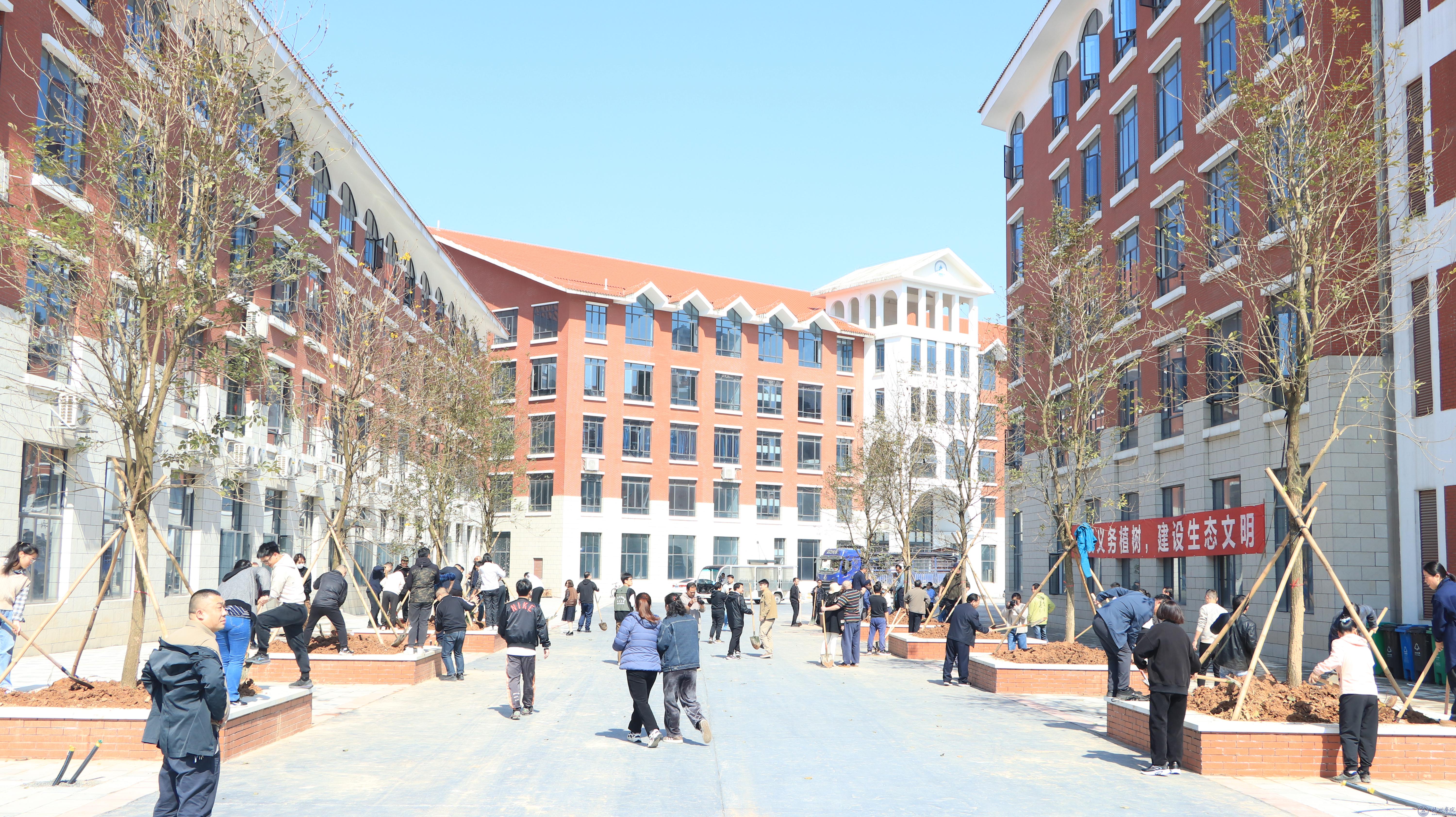 在植树活动现场,悬挂着“义务植树共建绿色和谐校园”“开展义务植树,建设生态文明”的横幅,学校领导和师生们一起植树,挖坑、栽树、填土、浇水、覆土,每一个环节都有序分工,配合默契。在大家的通力合作下,共种植树木75棵,其中桂花树56棵,黄花风铃树19棵,一棵棵新栽种的树木在三月暖阳的照耀下,矗立在校园,向阳而生。