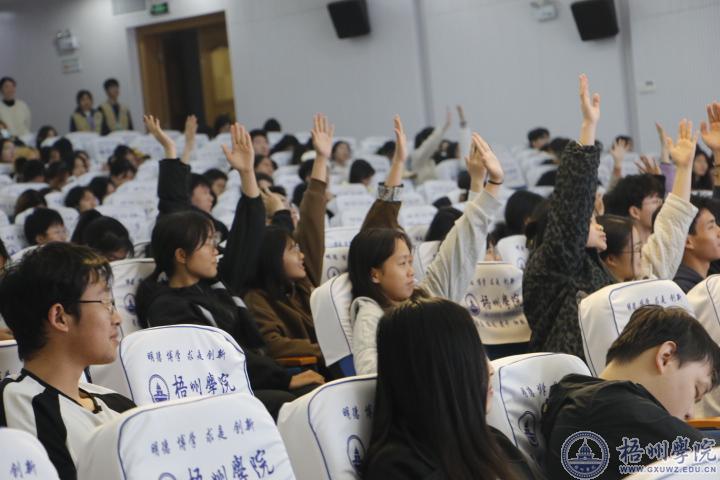 讲座现场,李智彬警官围绕什么是电信网络诈骗,涉诈案件的现状分析,指出校园常见的诈骗手法及防范措施,让同学们时刻筑好心理防线。杨洋副行长以直观的案例分析,向同学们讲解识别和防范电话诈骗、校园贷等。甘敏瑜经理为同学们解答如何管理好个人账户,并介绍当前形式多样的金融诈骗。整个讲座中,现场气氛活跃,参会学生和老师积极参与互动,反响良好。