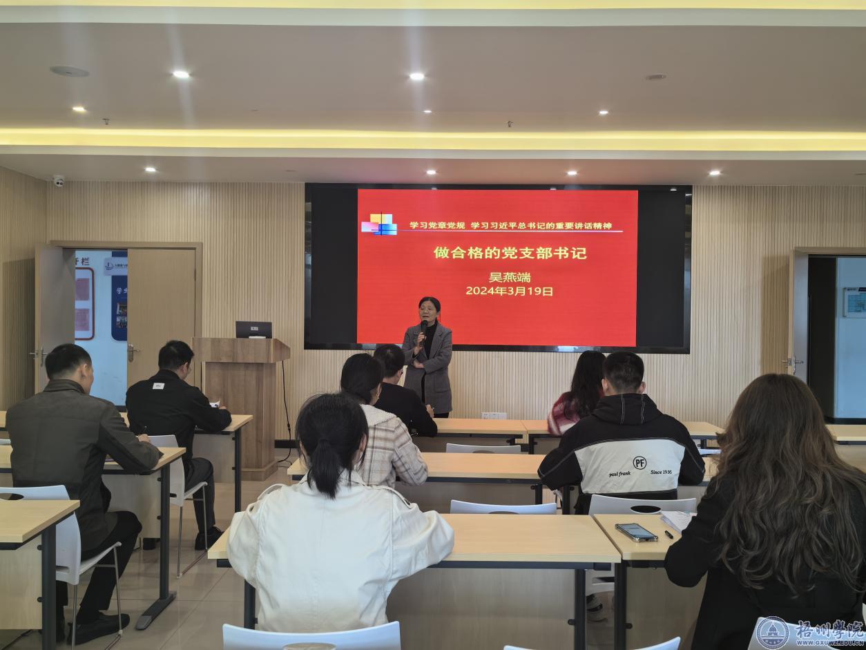培训会上,学院党委书记吴燕端从“学习党史,认识党支部书记工作的重要性”、“学习党章,理解党支部书记的职责”及“学习习近平总书记的重要讲话精神,掌握做合格党支部书记的本领”三个方面来讲解作为支部书记的史命担当。强调作为基层党支部书记应在党建工作中努力锤炼自己,提升政治思想素质,练就过硬本领和作风,创新党务工作方式方法。