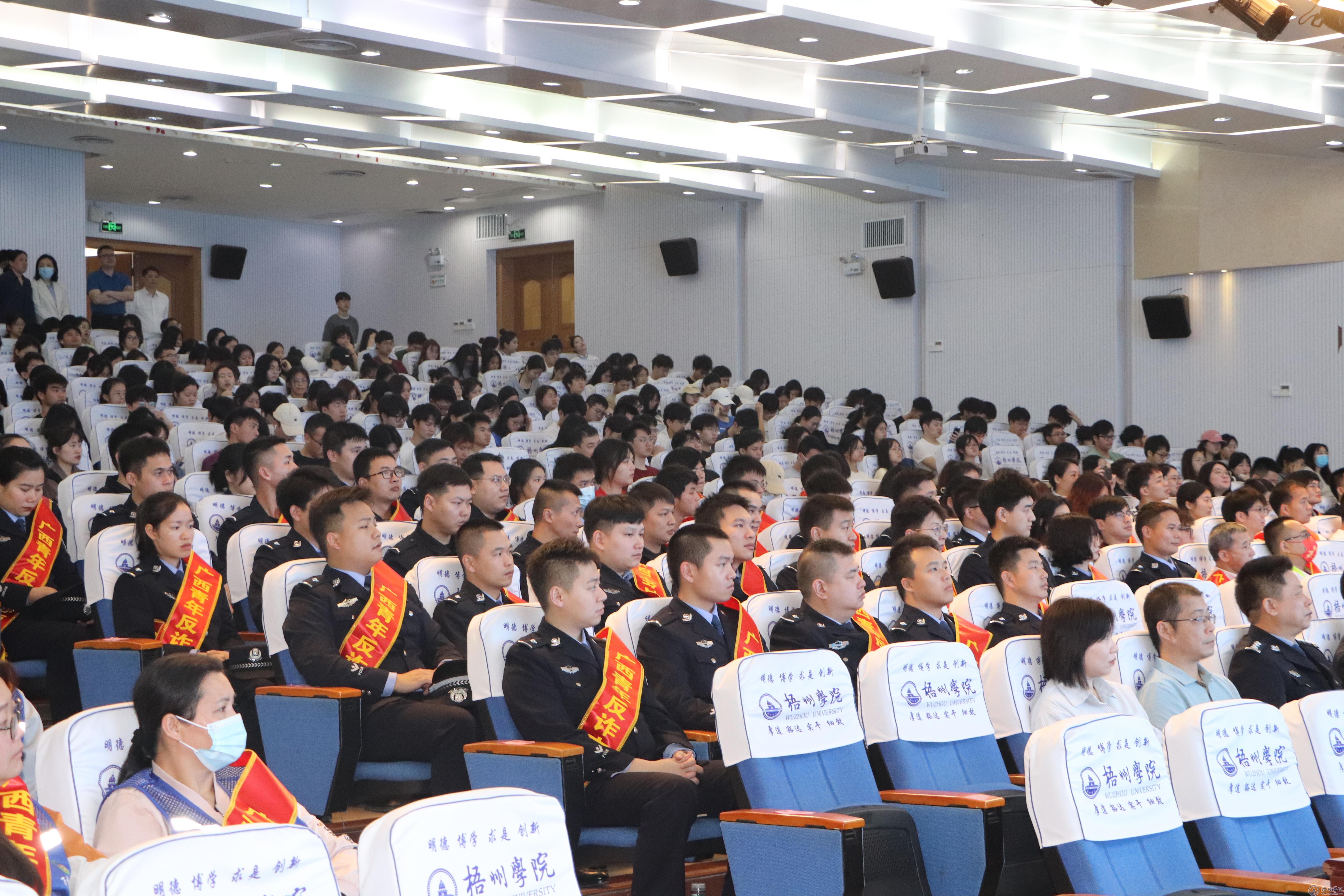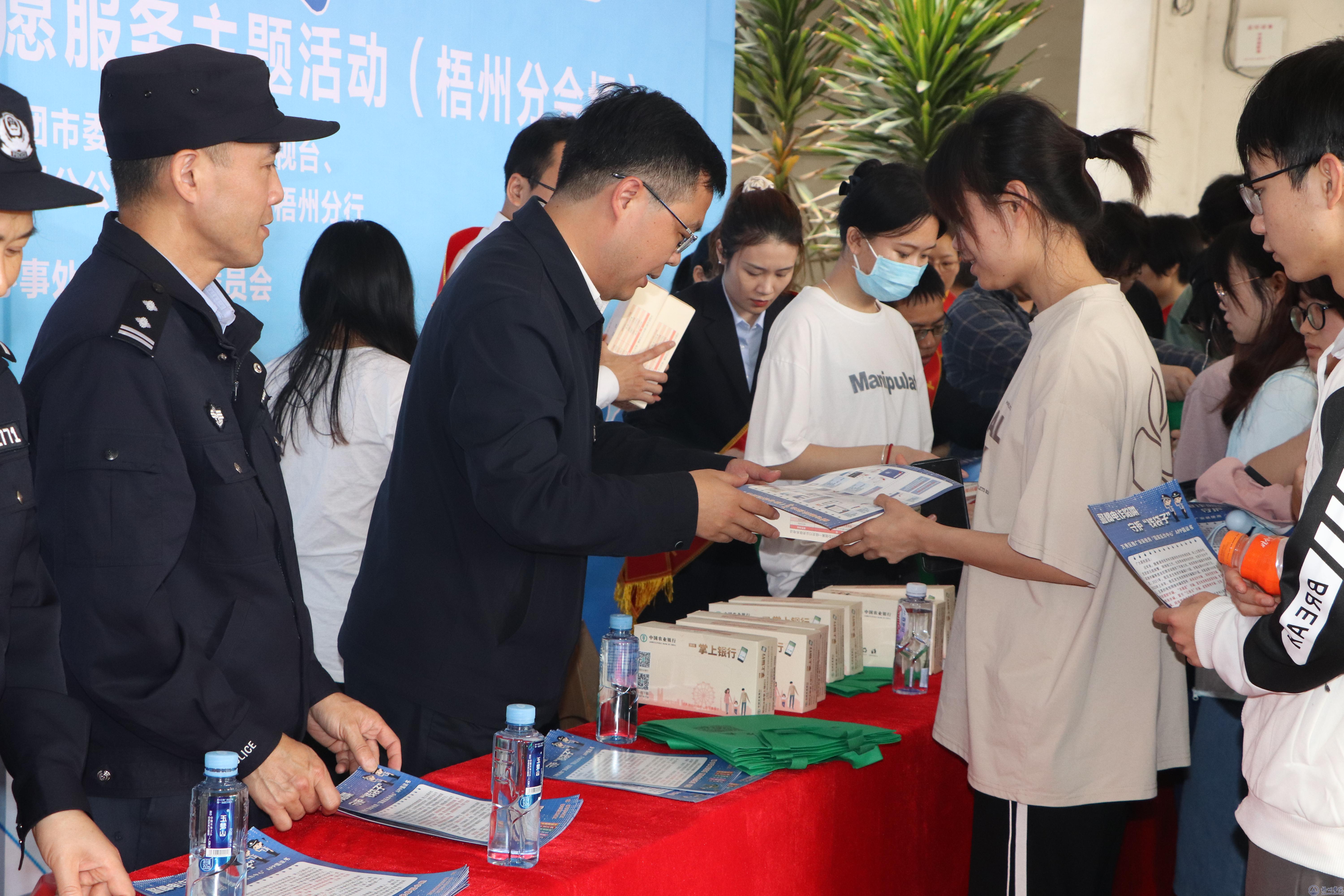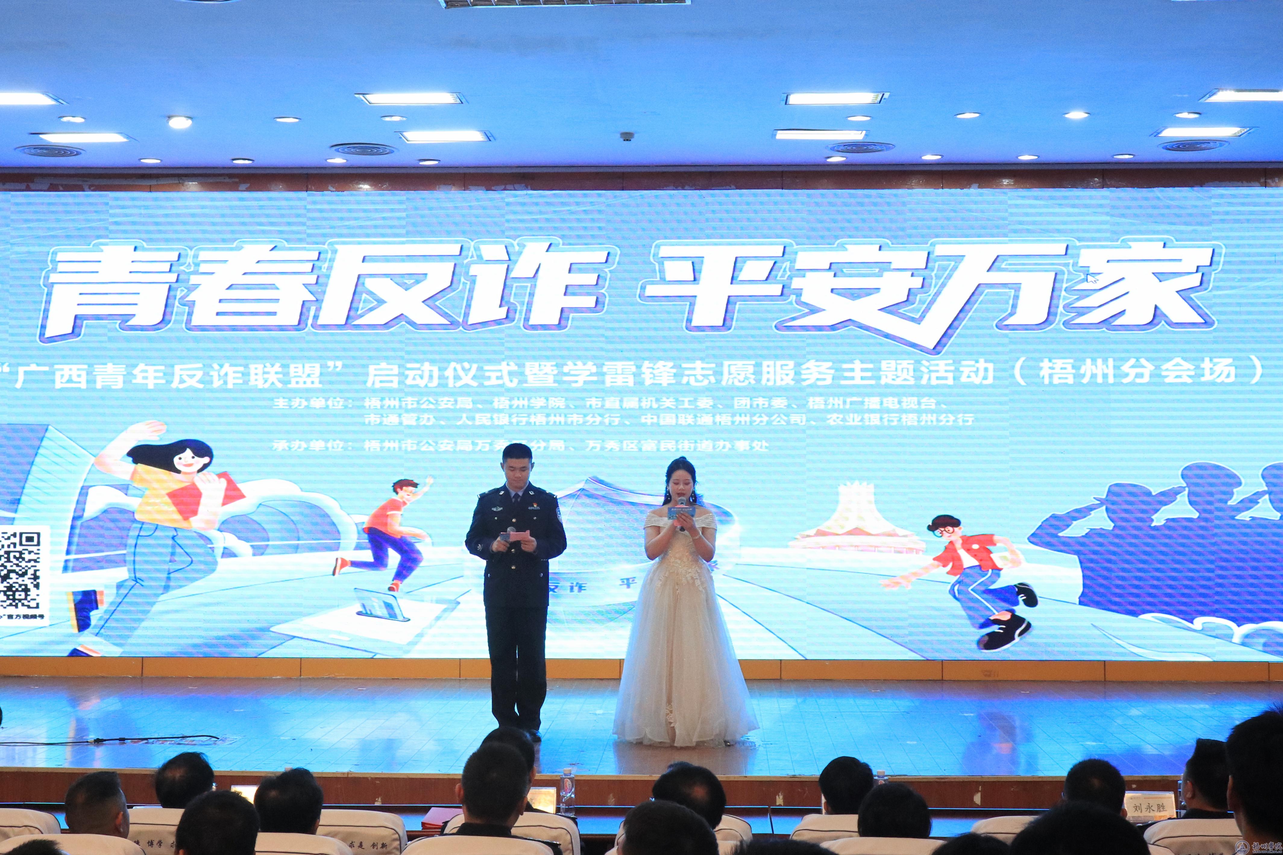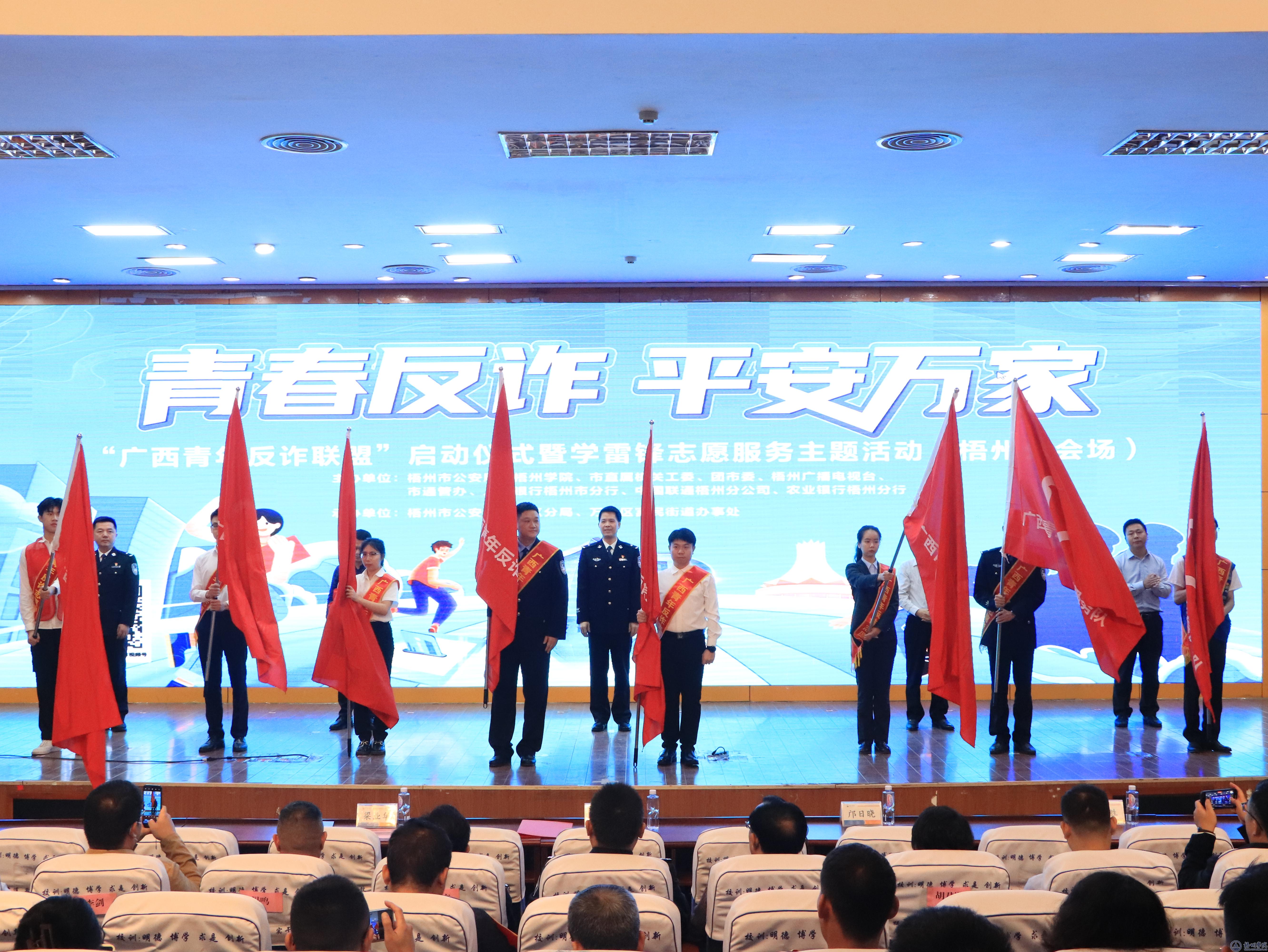 为贯彻落实上级部署要求,坚决扛起打击治理电信网络诈骗犯罪工作的政治要求,增强人民反诈意识。3月24日上午,在明理楼一楼学术报告厅举行“广西青年反诈联盟”启动仪式暨学雷锋志愿服务主题活动(梧州分会场)。梧州市副市长、市公安局党委书记、局长劳高进,学校党委副书记梁业华,梧州市公安局党委委员、副局长刘永胜,市直机关工委副书记邝日晓,共青团梧州市委员会副书记于万中出席活动。