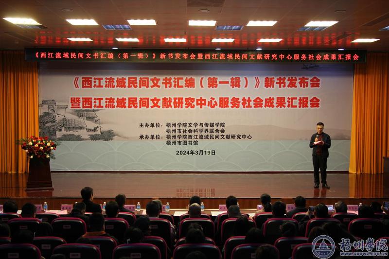 3月19日,由梧州学院文学与传媒学院、梧州市社会科学界联合会共同主办,梧州学院西江流域民间文献研究中心与梧州市图书馆联合承办的《西江流域民间文书汇编(第一辑)》新书发布会暨西江流域民间文献研究中心服务社会成果汇报会在梧州市图书馆举行。梧州学院校长、西江流域民间文献研究中心主任杨奔,梧州市委常委、宣传部部长黄恩出席发布会,并分别做讲话。