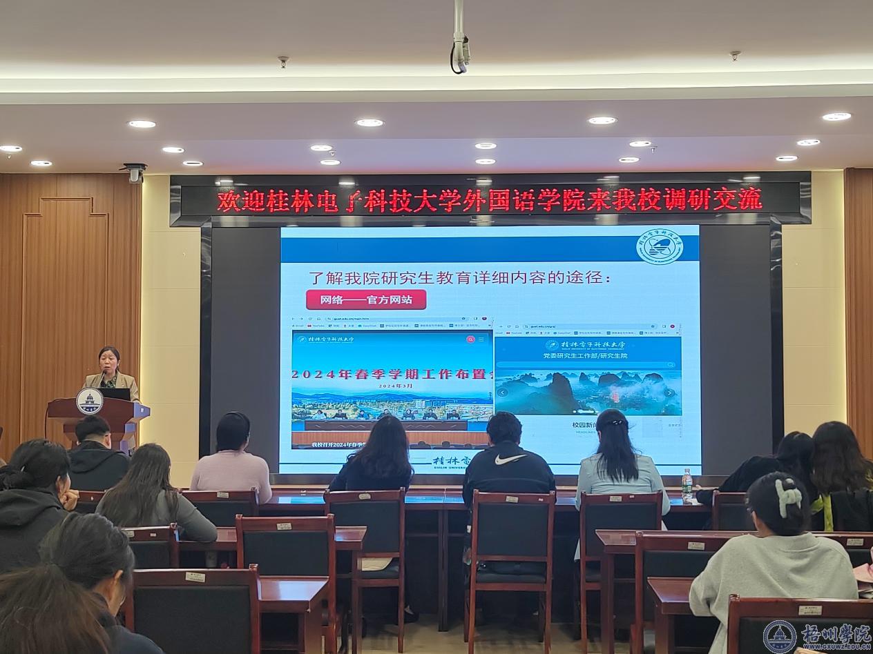 学院院长宋银秋介绍了学院的办学理念、人才培养定位、专业设置等情况。黄宇元院长介绍了桂电外国语学院在学生分类培养、学位点建设等方面的特色亮点。学院党委书记朱宇乾表示,希望双方今后在专业建设、研究生生源基地建设等方面深度合作,共同谋划学生成长成才之路。双方还就应用型人才培养、一流课程建设、教育教学管理等方面展开了广泛深入的沟通与交流。