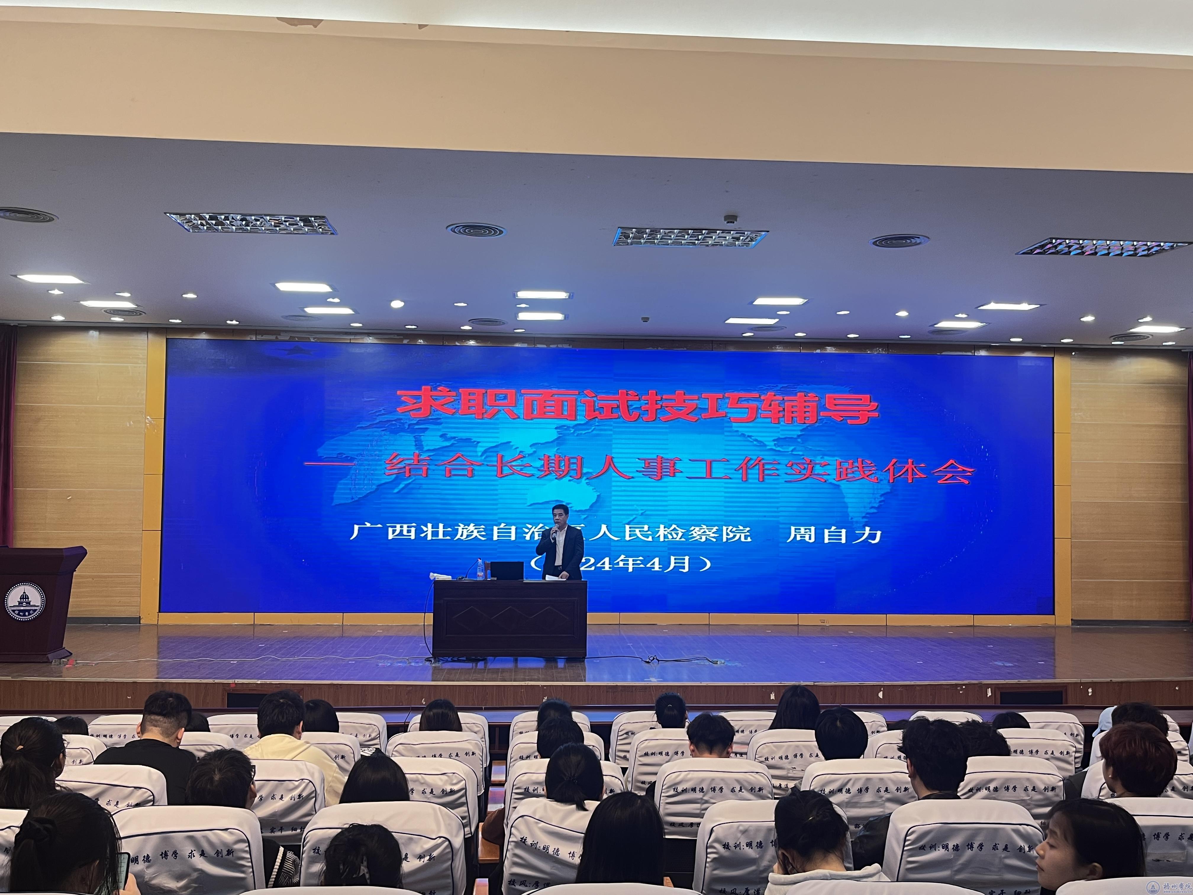 4月8日晚,为提高学生的求职面试能力,法学院特邀请广西壮族自治区人民检察院特级检察官助理周自力在明理楼学术报告厅作了《求职面试技巧辅导——结合长期从事面试工作实践体会》的专题讲座。法学院21级、22级全体学生以及23级部分学生参加讲座。