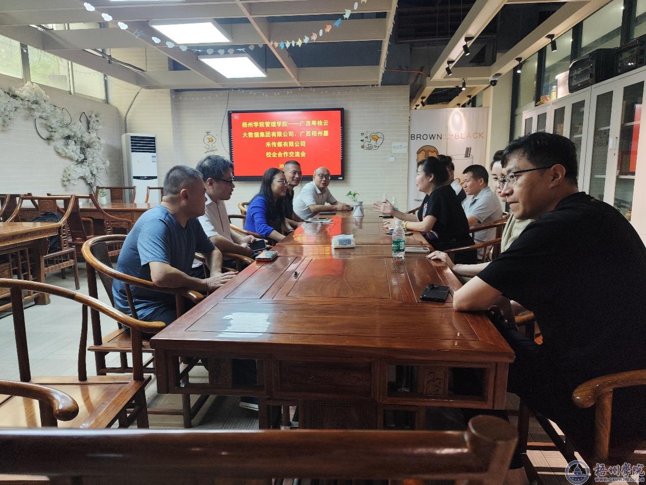 4月17日,广西粤桂云大数据集团有限公司董事长萨日娜、广西梧州嘉禾传媒有限公司董事长张宥晴一行到管理学院洽谈校企合作事宜,萨日娜介绍了企业目前业务及成就,提出未来与管理学院在人才供给、抖音直播带货等项目上的合作愿景。张宥晴希望与管理学院共同开展管理实战人才就业创业孵化计划,融合校企双方的需求,与管理学院共建校内校外校企管理专业人才孵化基地及实践教学基地,从而培育孵化更多的管理实战人才。