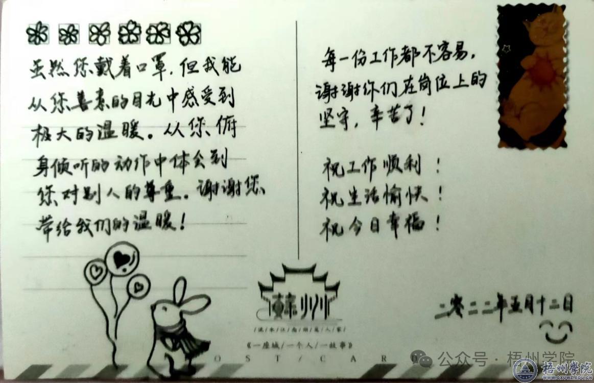 门卫叔叔阿姨服务态度非常好,始终微笑待人,让人感到温暖亲切,每次从外面回到学校就像回到了家一样。——食品与制药工程学院2022级食品与制药工程2班张晓涵