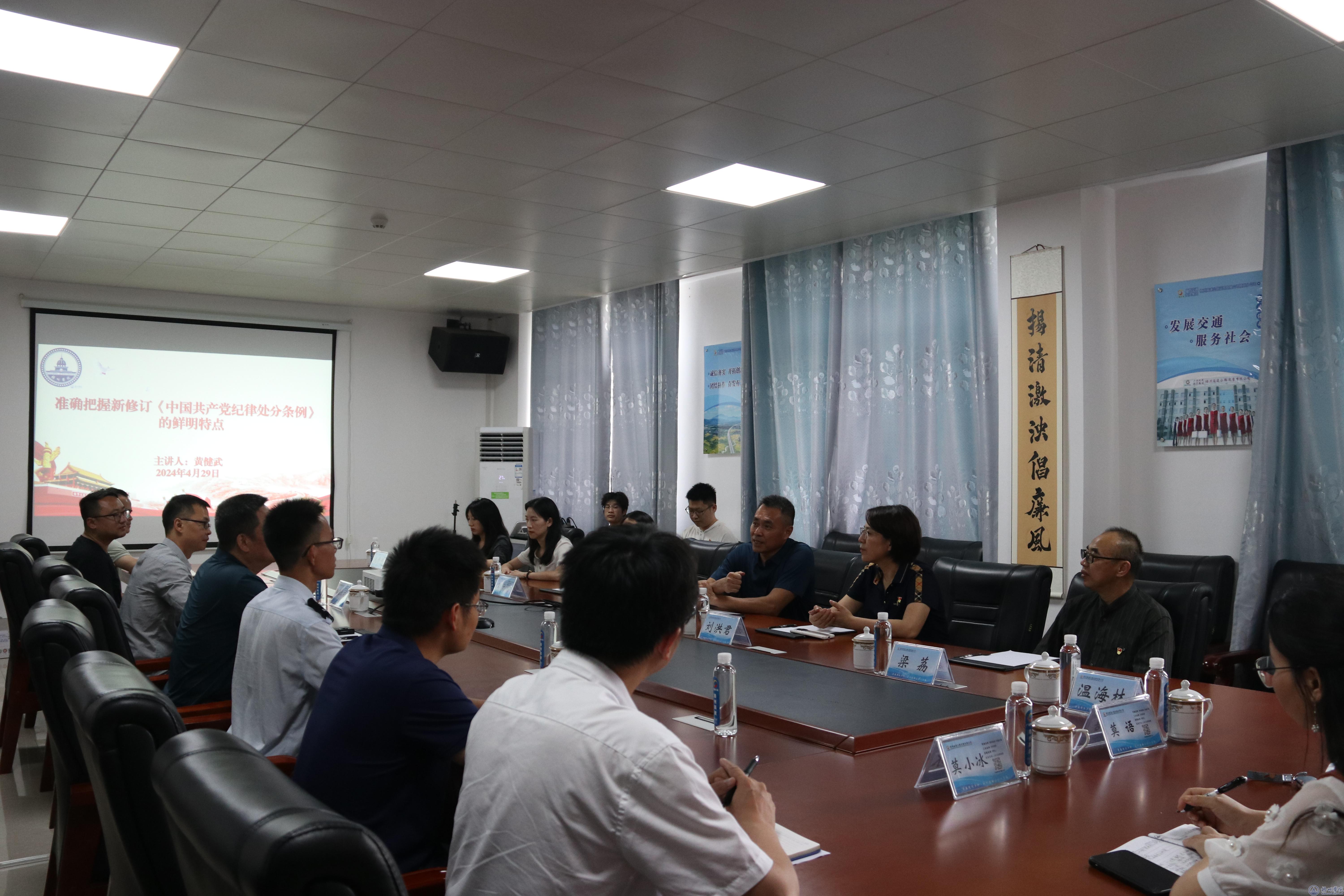 活动中,师生党员集体参观了该公司的梧州北管理分中心、收费站、营运应急中心等部门,召开了座谈会讲授了党课,听取了该公司在党建、企业管理等方面的经验与做法,双方就企业用人、学校人才培养、校企合作、产教融合等方面进行了热烈的探讨交流。最后,在组织部部长黄健武的领学下,师生党员共同学习了修订后的《中国共产党纪律处分条例》内容。