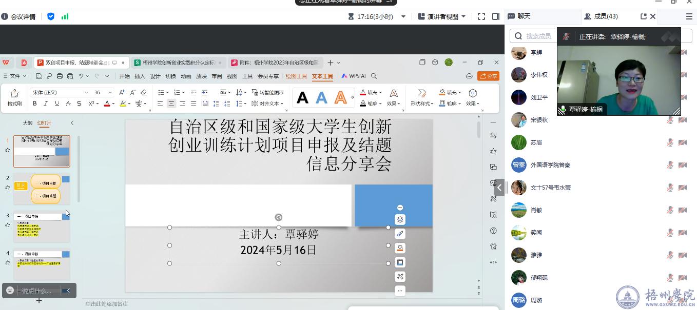 为加强大学生创新创业训练计划项目的组织申报工作,外国语学院于5月15日至16日举办线上专题培训会,邀请电子与信息工程学院李志军老师以及本学院的覃驿婷、肖敏两位老师面向全院教师和部分学生进行政策解读和申报辅导。