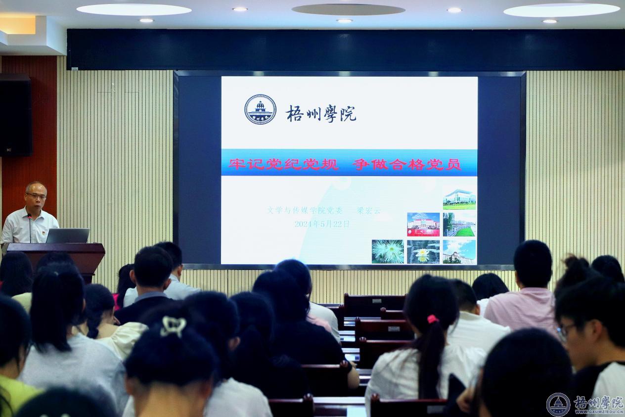 5月22日,文学与传媒学院党委在明理楼七楼视频会议室举行“牢记党纪党规 争做合格党员”党纪学习教育专题党课,解读新修订的《中国共产党纪律处分条例》。党课由学院党委书记梁宏云主讲,学院全体师生党员参加。