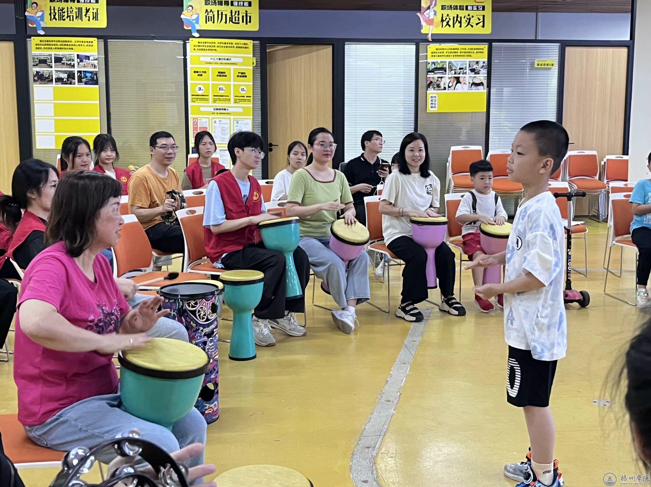 亲子鼓圈活动,在学校关爱下一代工作委员会石夏莉老师的引导下,家长、孩子以及大学生围坐成一个两层大圈,每人手中都有一种乐器,在历时一个半小时的活动中,家长与孩子全程热情参与到鼓圈身势打击体验、节奏雕塑体验、游戏以及手语舞等环节中。