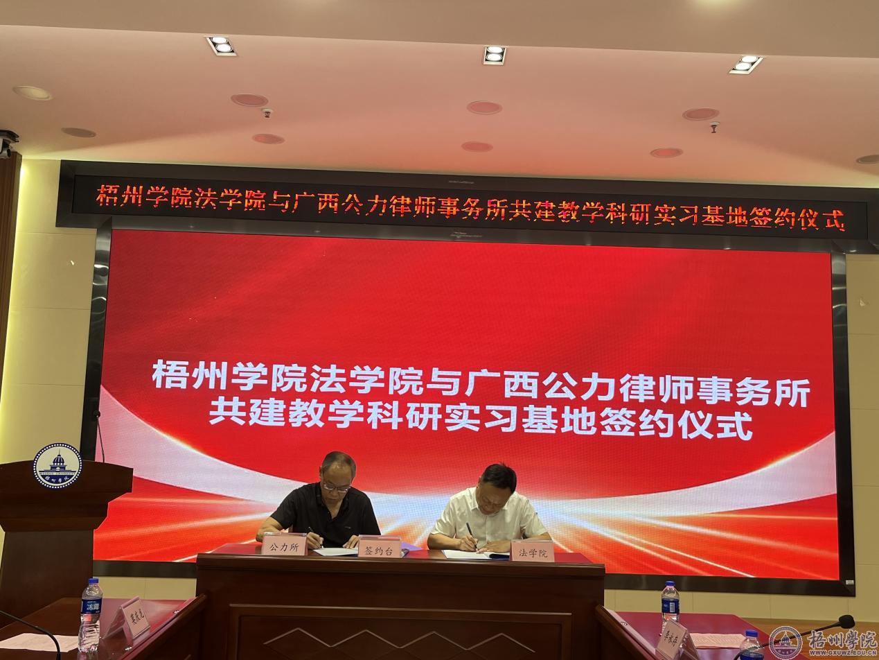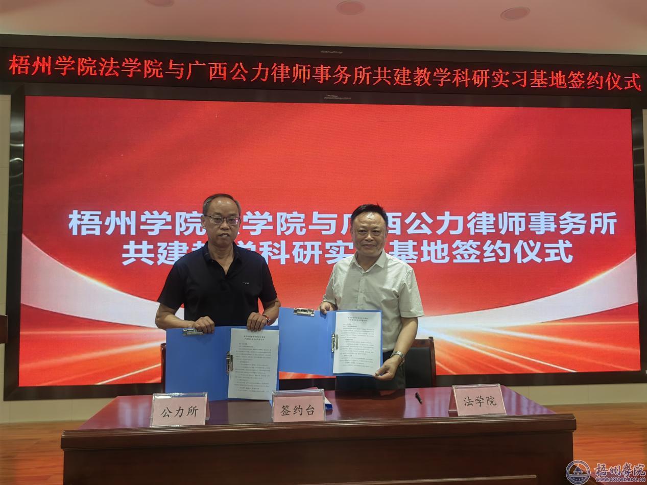 6月13日下午,法学院与广西公力律师事务所共建法学专业教学科研实习基地签约仪式在明科楼学术报告厅举行,法学院院长骆庆国与广西公力律师事务所主任陈鉴林代表双方签署协议,授予广西公力律师事务所“梧州学院教学科研实习基地”牌匾。广西公力律师事务所部分律师代表和法学院教师代表参加了签约仪式。