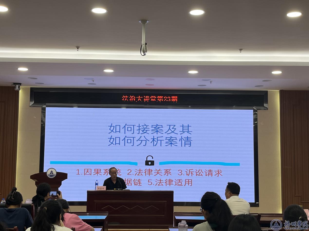 为进一步提高法学院学生的实践能力和专业素养,把应用型法治人才的培养落到实处。613日下午法学院在明科楼学术报告厅举行了“法治大讲堂”系列讲座第23讲,邀请广西公力律师事务所主任陈鉴林律师为法学院22级和23级部分学生作《如何接案及其如何分析案情》的专题讲座。