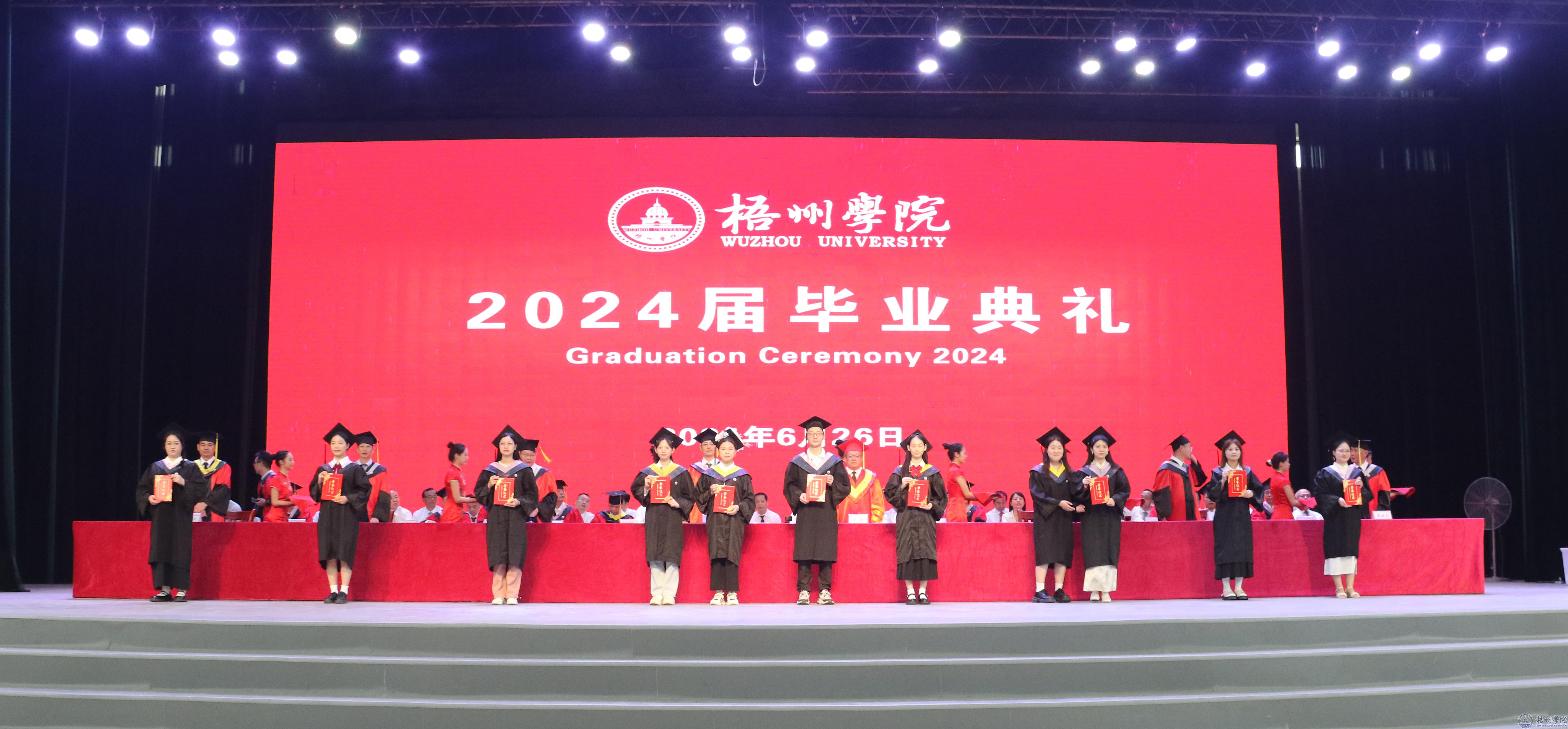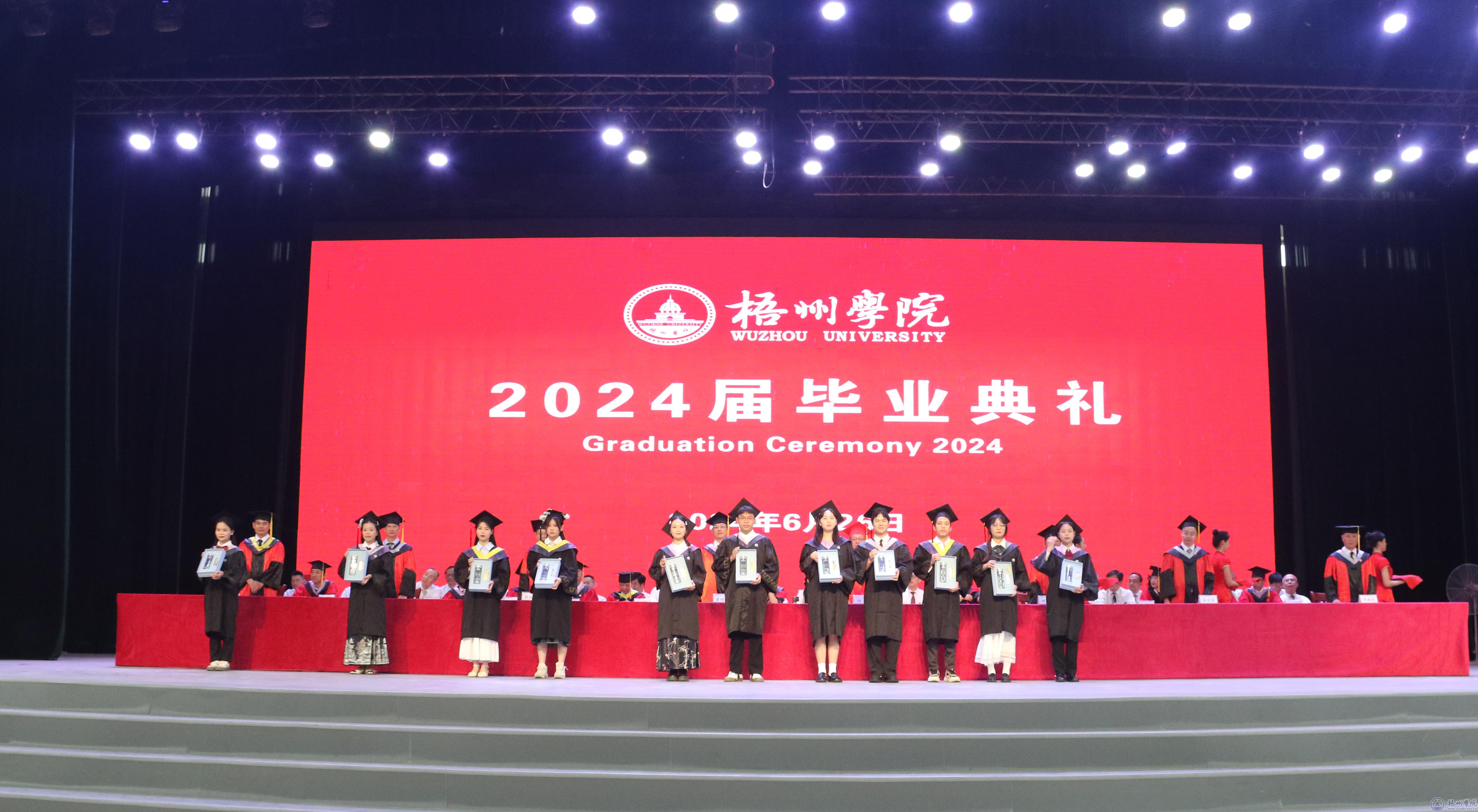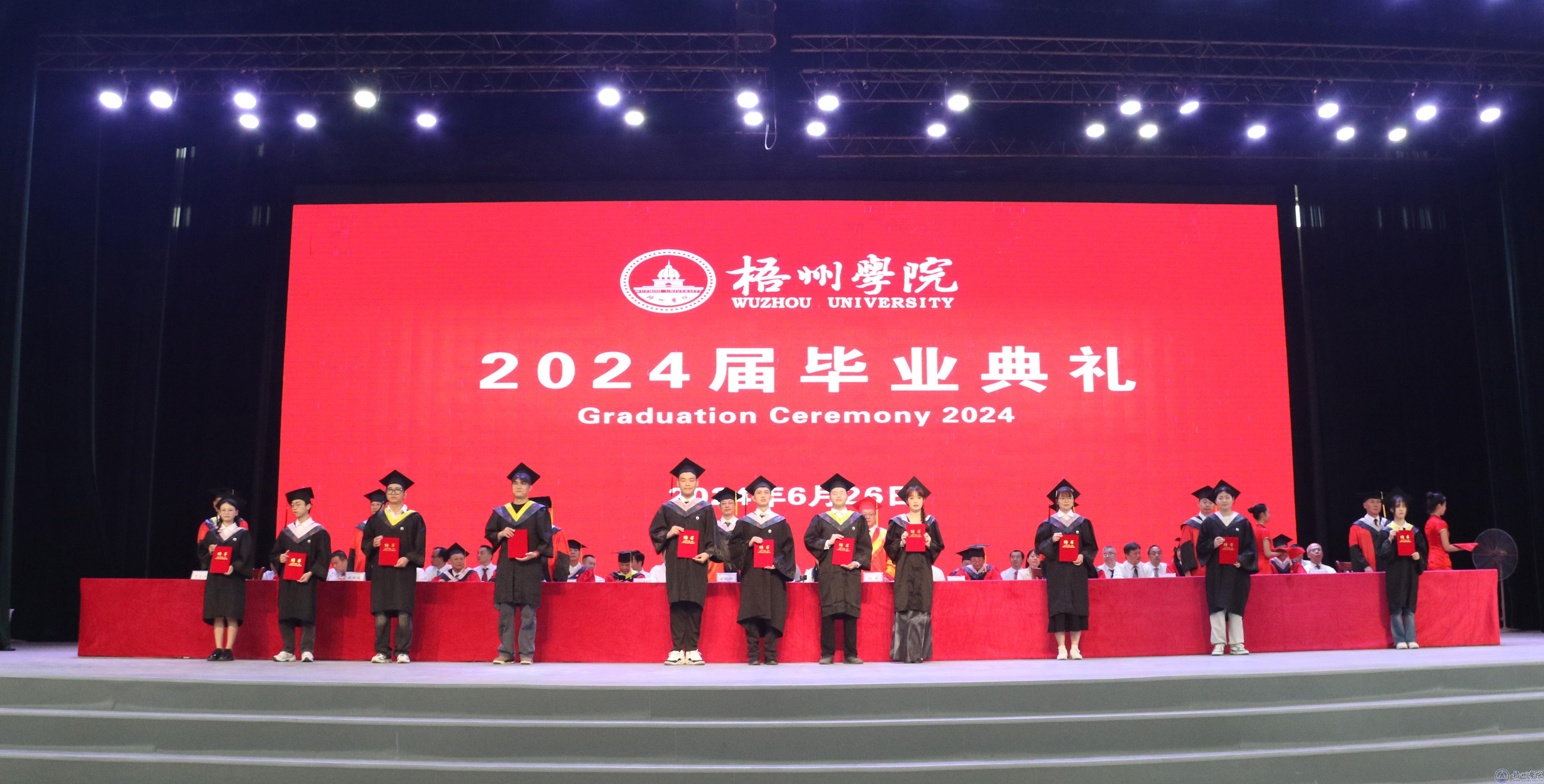 毕业典礼在嘹亮的国歌声中拉开帷幕。副校长覃雄彪宣读我校关于准予2024届普通全日制本专科学生毕业的文件,学校领导为毕业生代表颁发毕业证书。副校长邱房贵宣读自治区教育厅关于认定2024届自治区普通高等教育优秀毕业生的文件,学校领导为自治区2024届普通高等教育优秀毕业生代表颁发荣誉证书。副校长麻新纯宣读我校关于表彰2024届普通高等教育优秀毕业生的文件,学校领导为我校2024届普通高等教育优秀毕业生代表颁发荣誉证书。纪委书记宾月景宣读我校2024届普通高等教育毕业生考取硕士研究生名单,学校领导为考取硕士研究生的毕业生代表发放奖金。副校长范生汝宣读入选2024年西部计划志愿者毕业生名单,学校领导为入选2024年西部计划志愿者发放补助金,为2024届全体毕业生代表赠送纪念品。